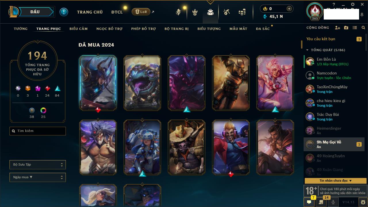 Rank Đơn: Bạc IIKhung: ĐồngTướng: 170 - Còn 62239 THXTrang Phục: 145Rank ĐTCL: Bạch Kim IIILinh Thú: 87