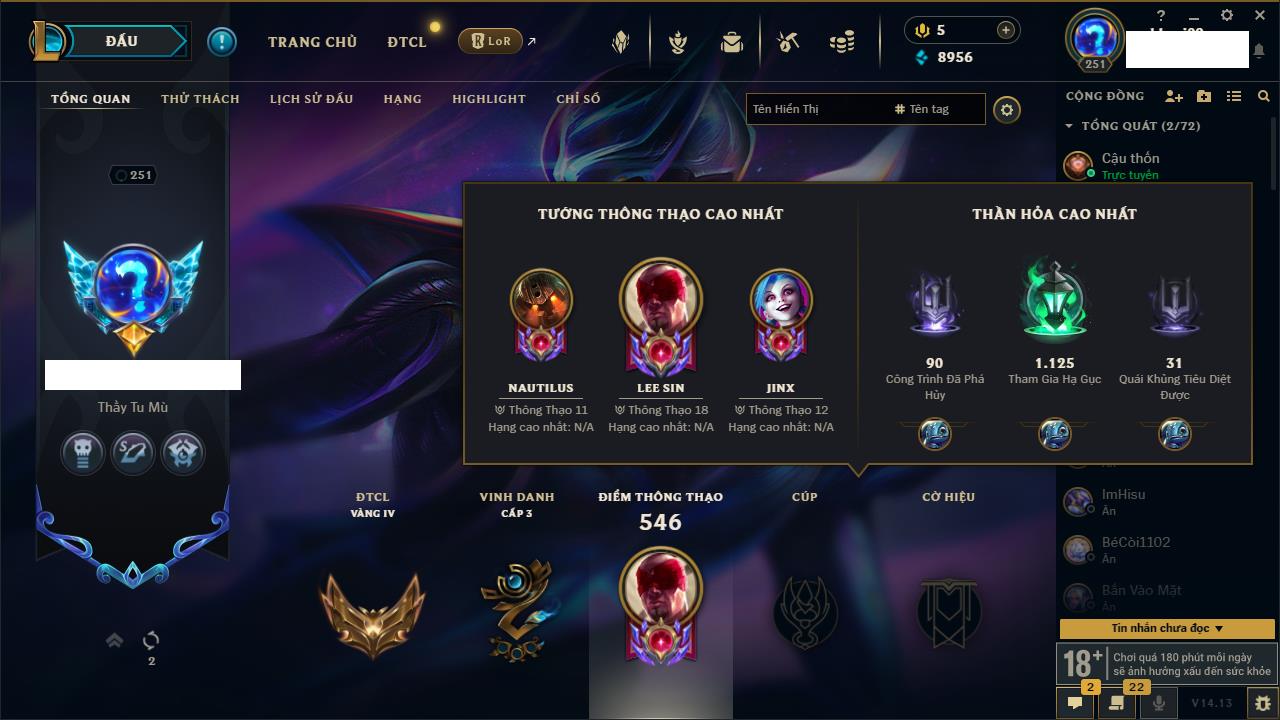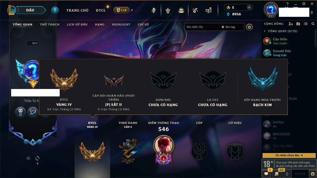 Rank Đơn: Vàng IKhung: BạcTướng: 171 - Còn 60584 THXTrang Phục: 286Rank ĐTCL: Vàng IIILinh Thú: 117