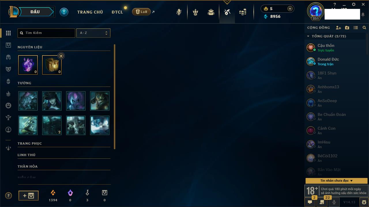 Rank Đơn: Bạch Kim IIIKhung: Bạch kimTướng: 171 - Còn 251383 THXTrang Phục: 229Rank ĐTCL: Sắt IILinh Thú: 51