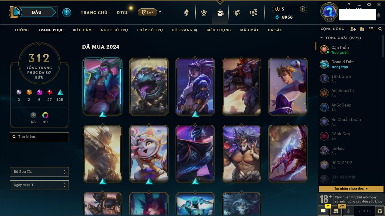 Rank Đơn: Vàng IIIKhung: VàngTướng: 171 - Còn 88128 THXTrang Phục: 329Rank ĐTCL: Chưa RankLinh Thú: 41