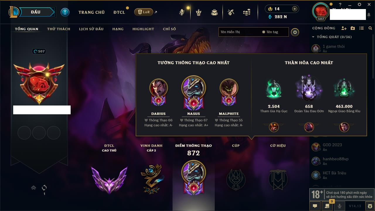 Rank Đơn: Vàng IVKhung: VàngTướng: 171 - Còn 48721 THXTrang Phục: 171Rank ĐTCL: Chưa RankLinh Thú: 27