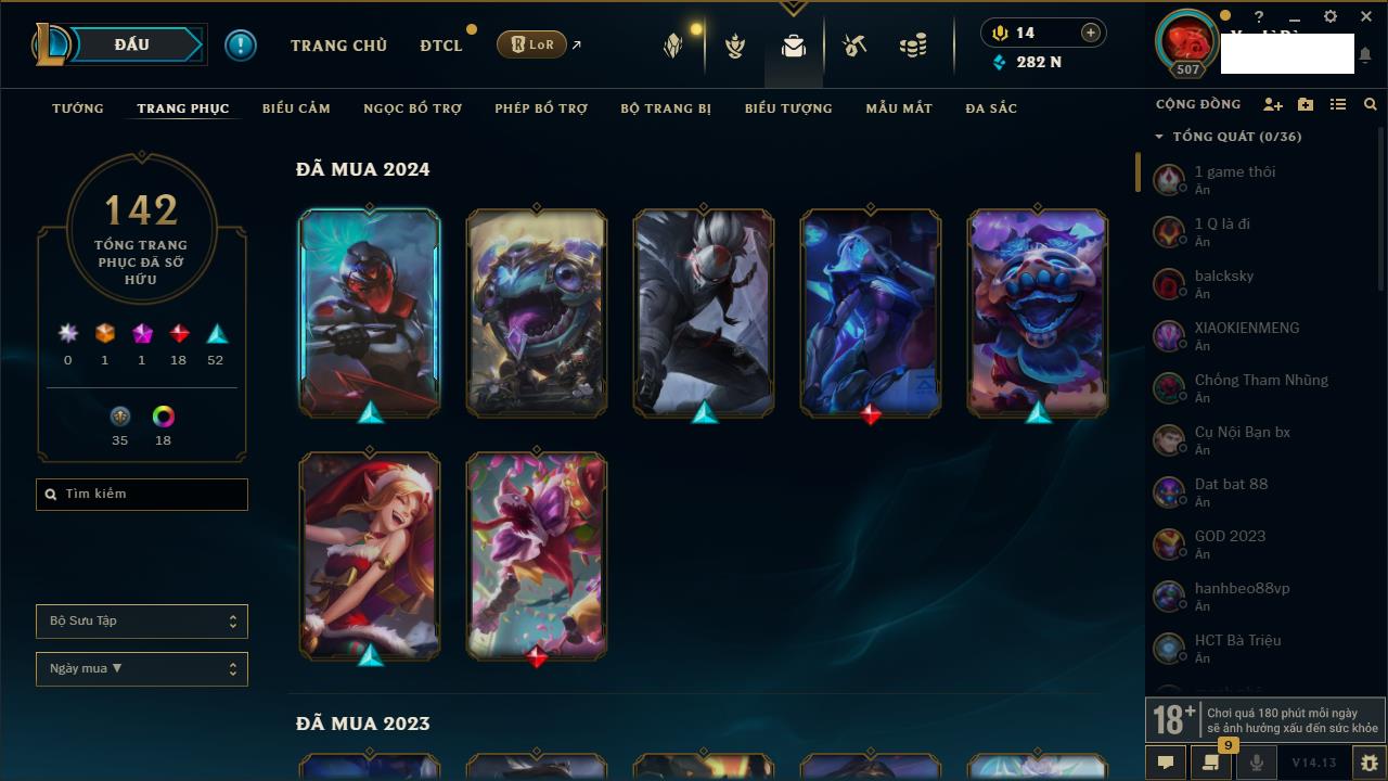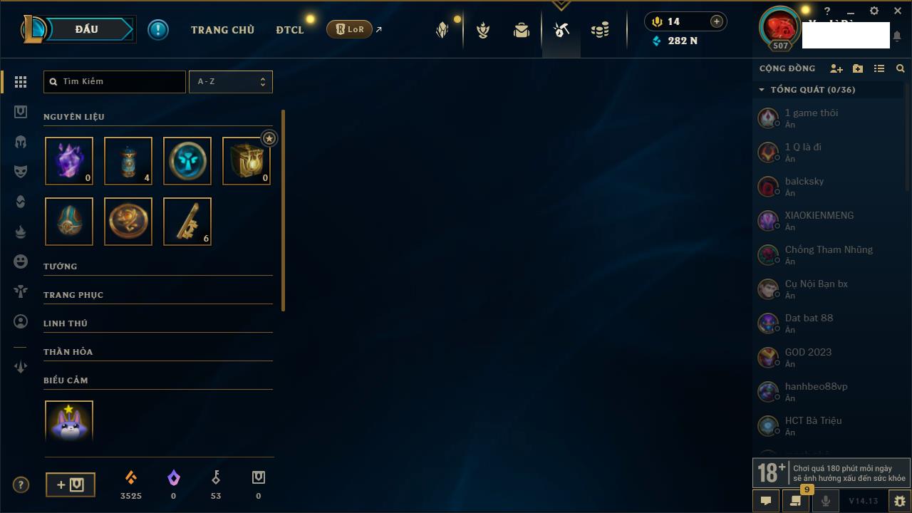 Rank Đơn: Vàng IVKhung: BạcTướng: 171 - Còn 426239 THXTrang Phục: 162Rank ĐTCL: Chưa RankLinh Thú: 33