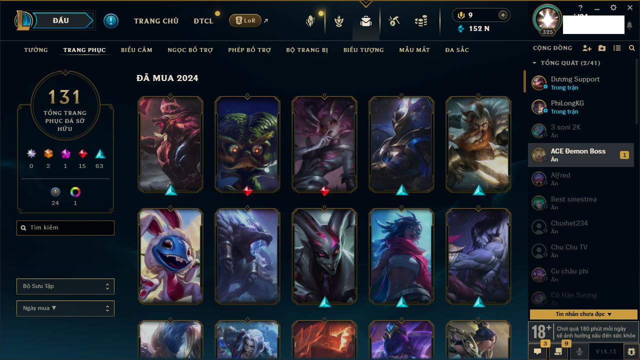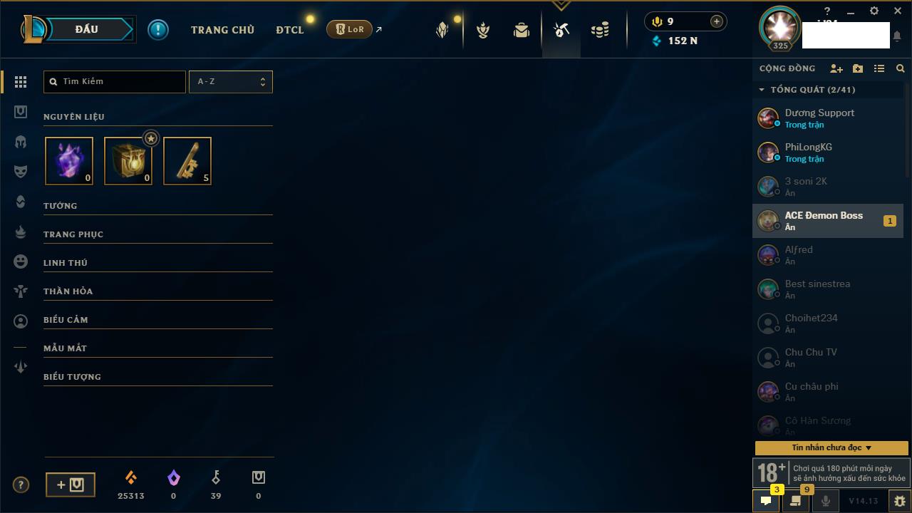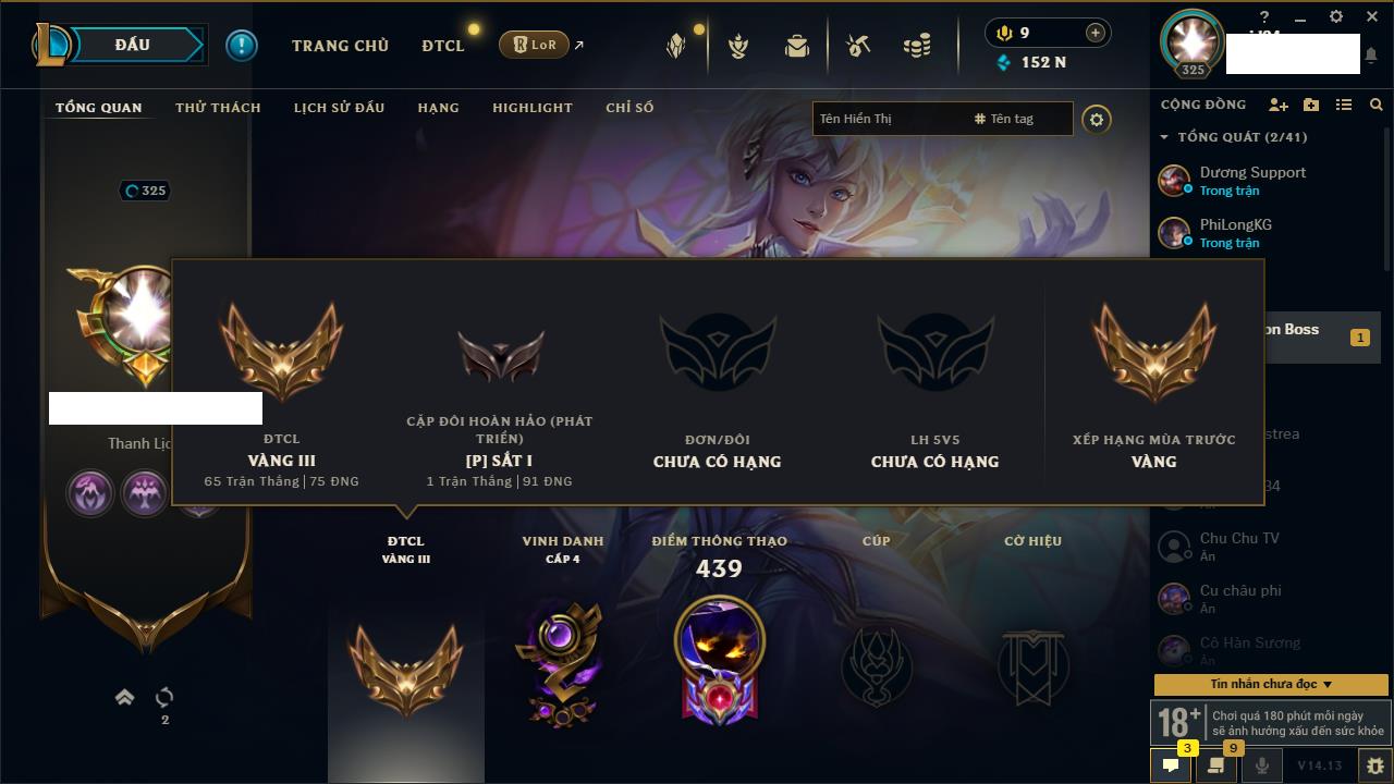 Rank Đơn: Vàng IIIKhung: BạcTướng: 171 - Còn 101359 THXTrang Phục: 88Rank ĐTCL: Kim Cương IVLinh Thú: 200
