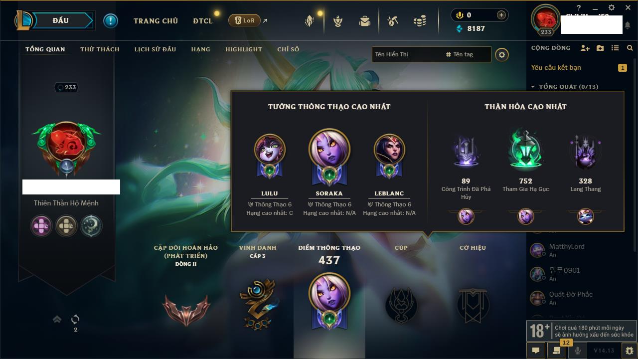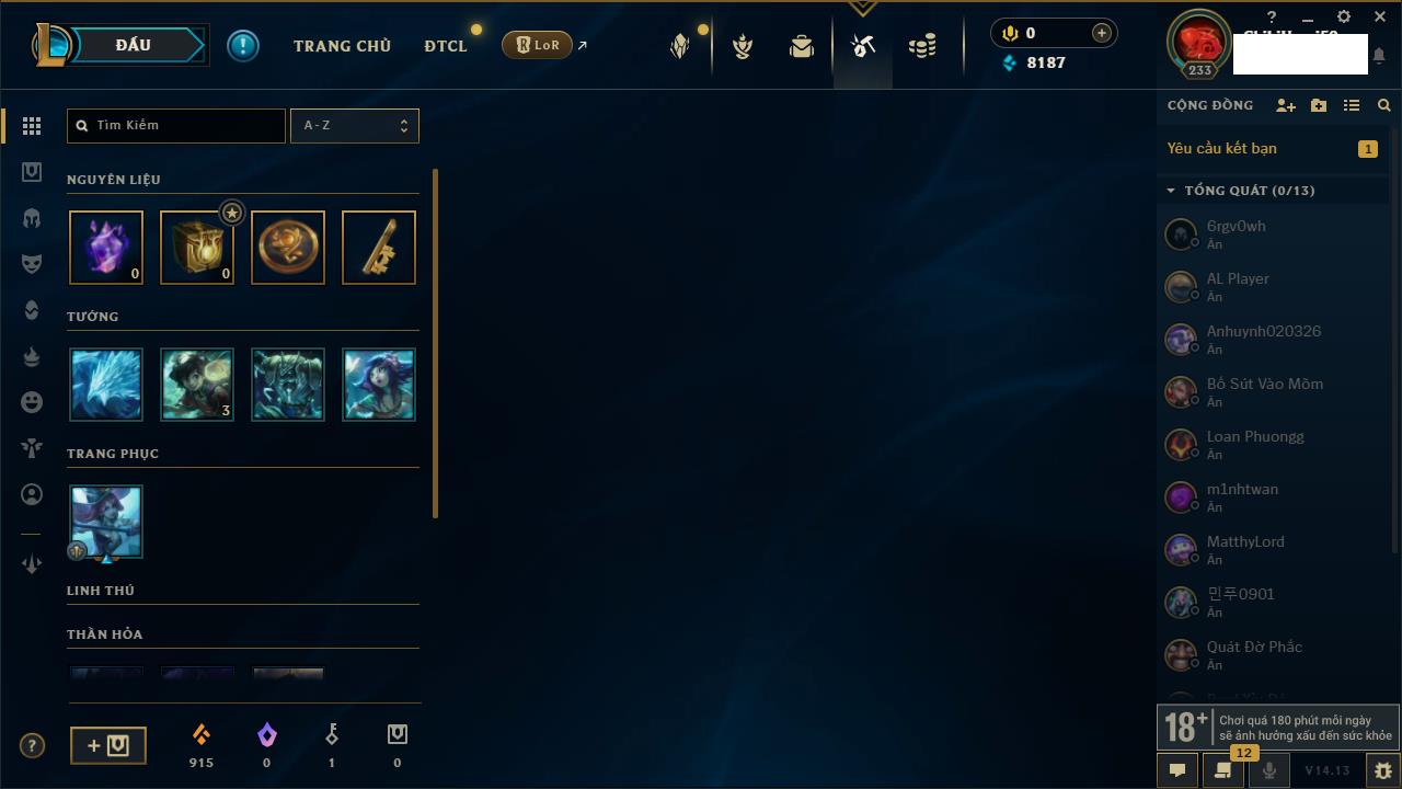 Rank Đơn: Chưa rank mùa nàoKhung: Chưa có khungTướng: 0 - Còn 2000 THXTrang Phục: 0Rank ĐTCL: Chưa RankLinh Thú: 14