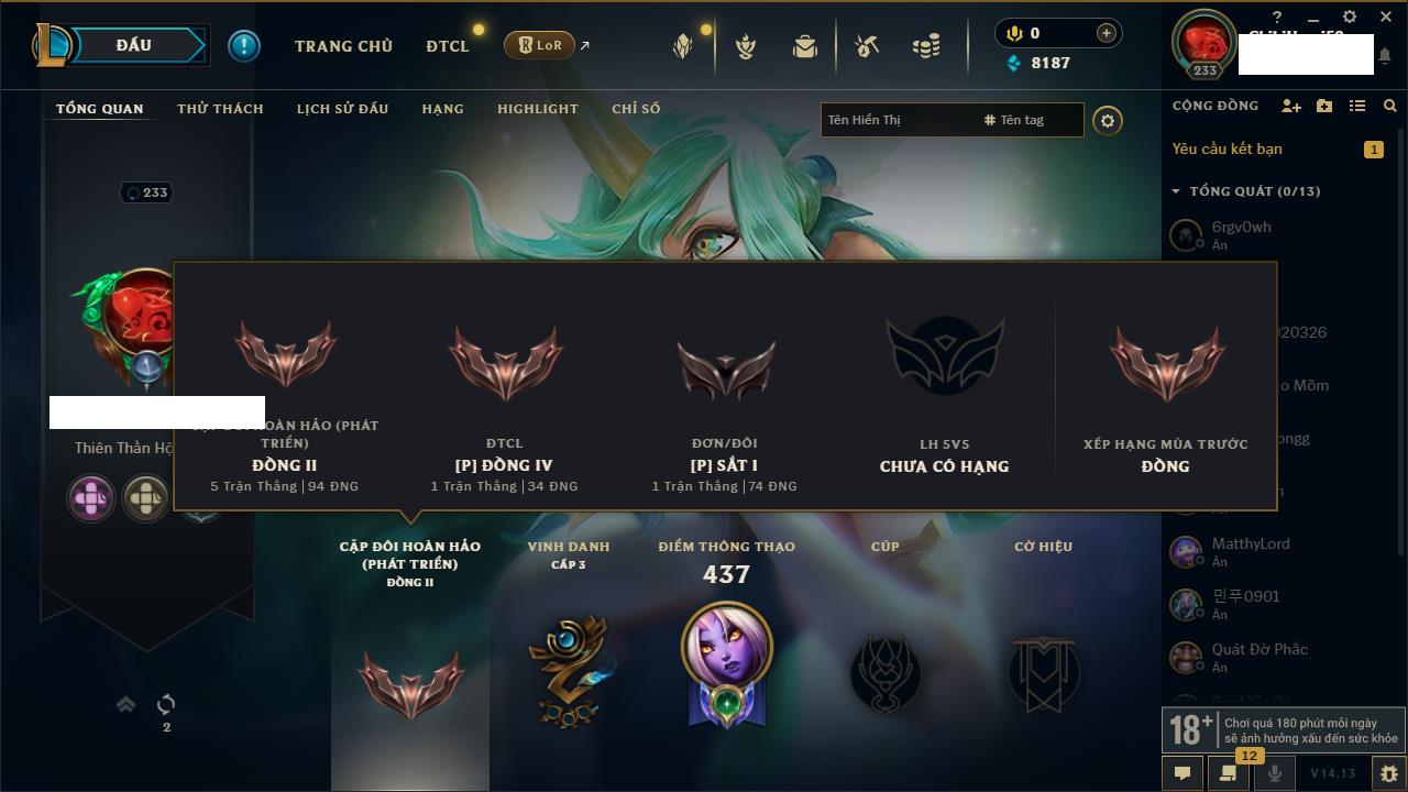 Rank Đơn: Chưa RankKhung: Chưa có khungTướng: 154 - Còn 18477 THXTrang Phục: 127Rank ĐTCL: Vàng ILinh Thú: 183