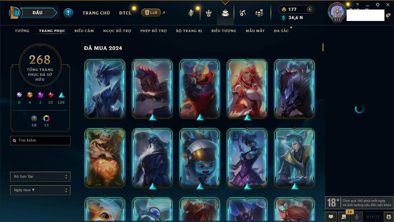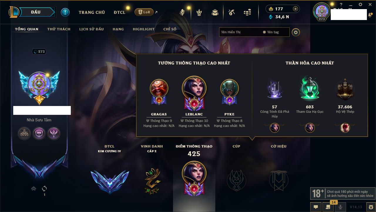 Rank Đơn: Bạc IIKhung: Bạch kimTướng: 169 - Còn 81813 THXTrang Phục: 301Rank ĐTCL: Chưa RankLinh Thú: 140