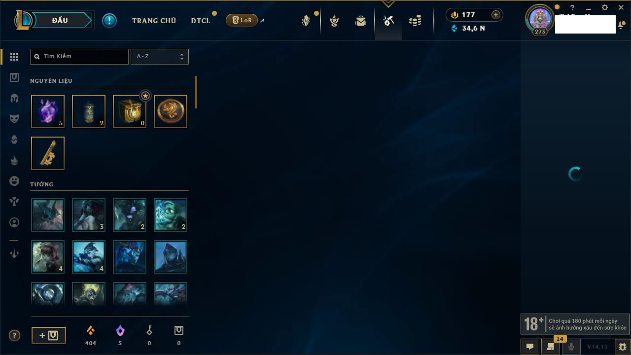 Rank Đơn: Sắt IVKhung: SắtTướng: 171 - Còn 231744 THXTrang Phục: 376Rank ĐTCL: Bạch Kim IILinh Thú: 120