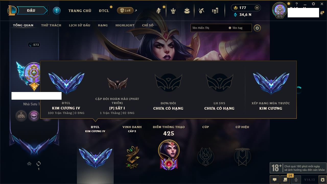 Rank Đơn: Lục Bảo IIKhung: Lục BảoTướng: 169 - Còn 15892 THXTrang Phục: 206Rank ĐTCL: Chưa RankLinh Thú: 270
