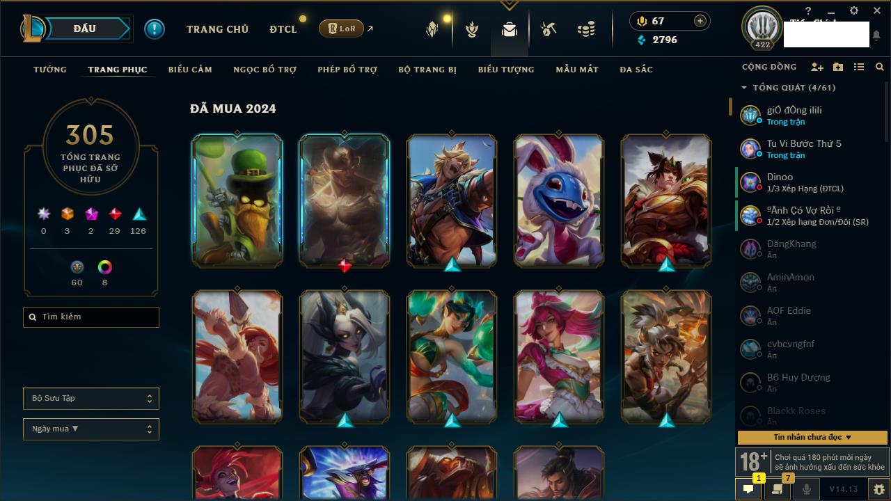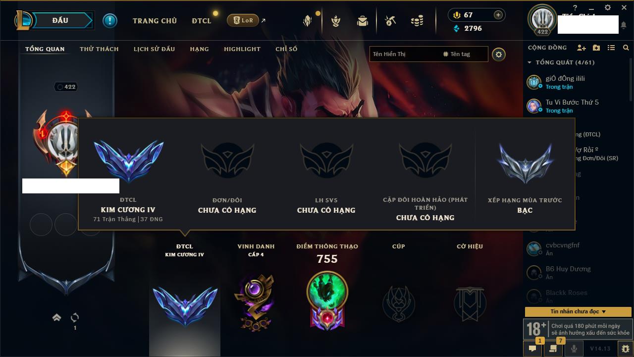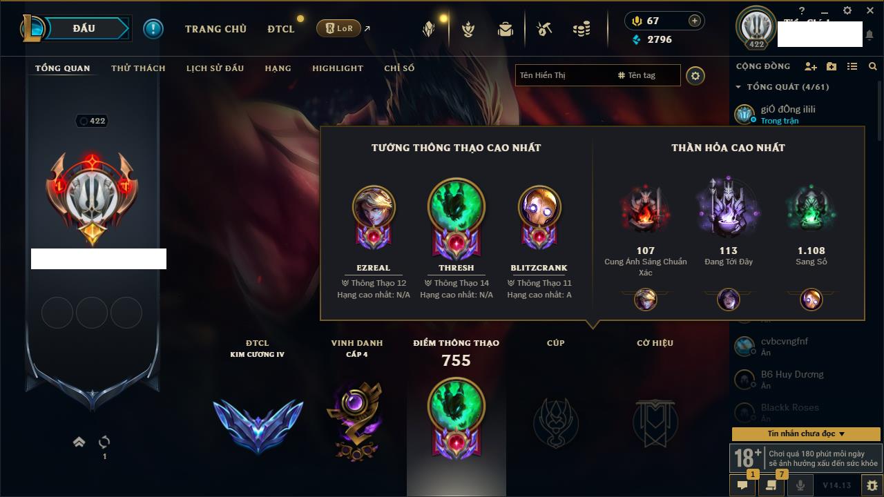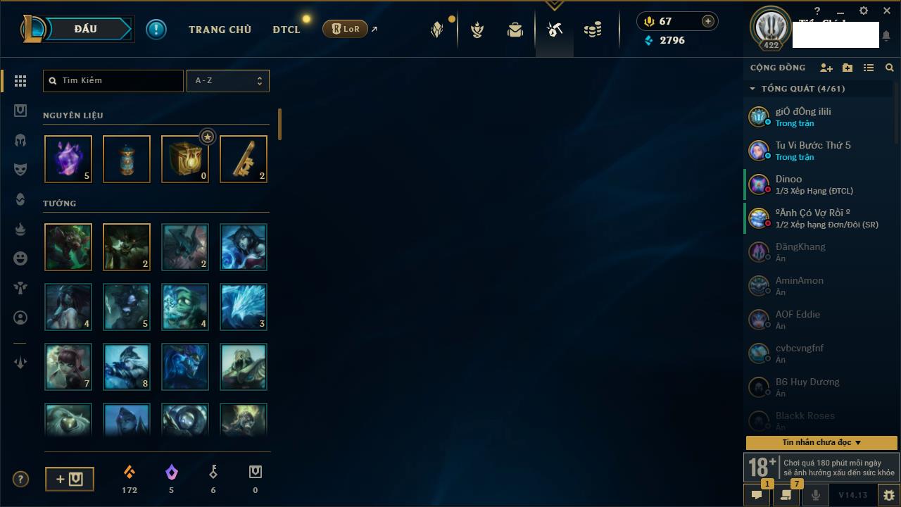 Rank Đơn: Vàng IKhung: BạcTướng: 171 - Còn 60584 THXTrang Phục: 286Rank ĐTCL: Vàng IIILinh Thú: 117
