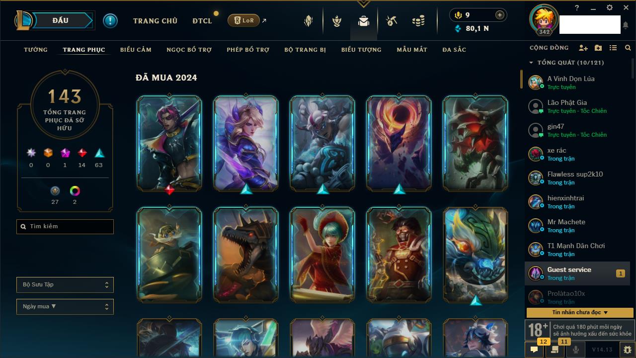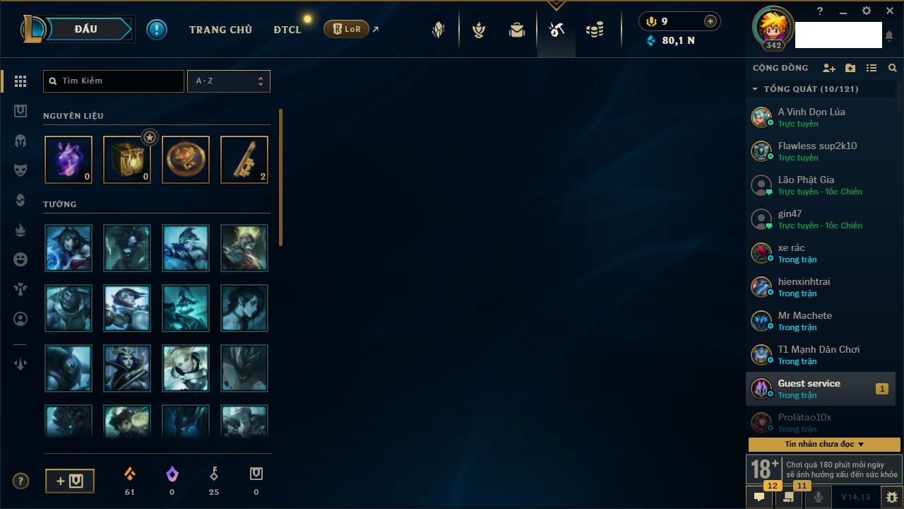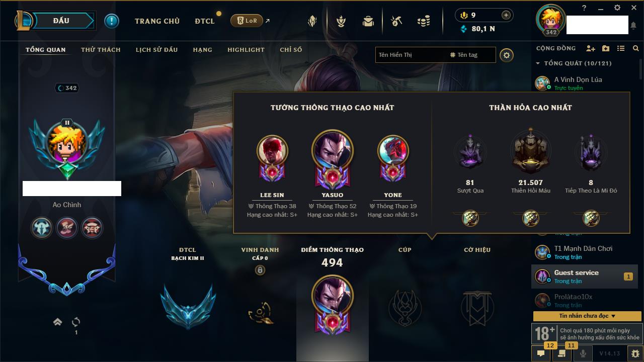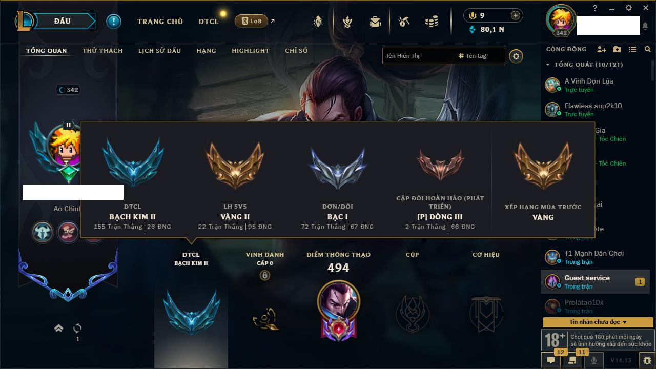 Rank Đơn: Vàng IVKhung: BạcTướng: 171 - Còn 426239 THXTrang Phục: 162Rank ĐTCL: Chưa RankLinh Thú: 33