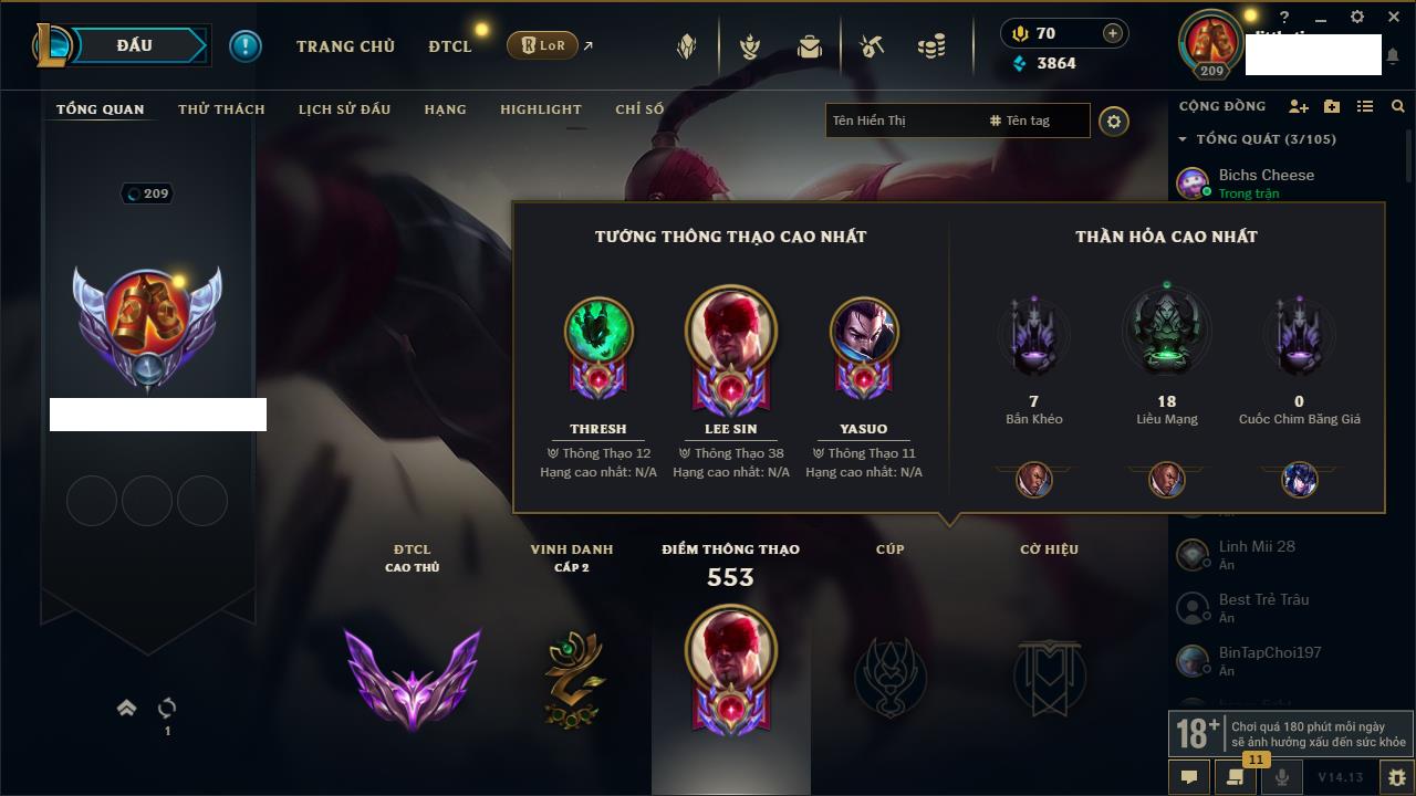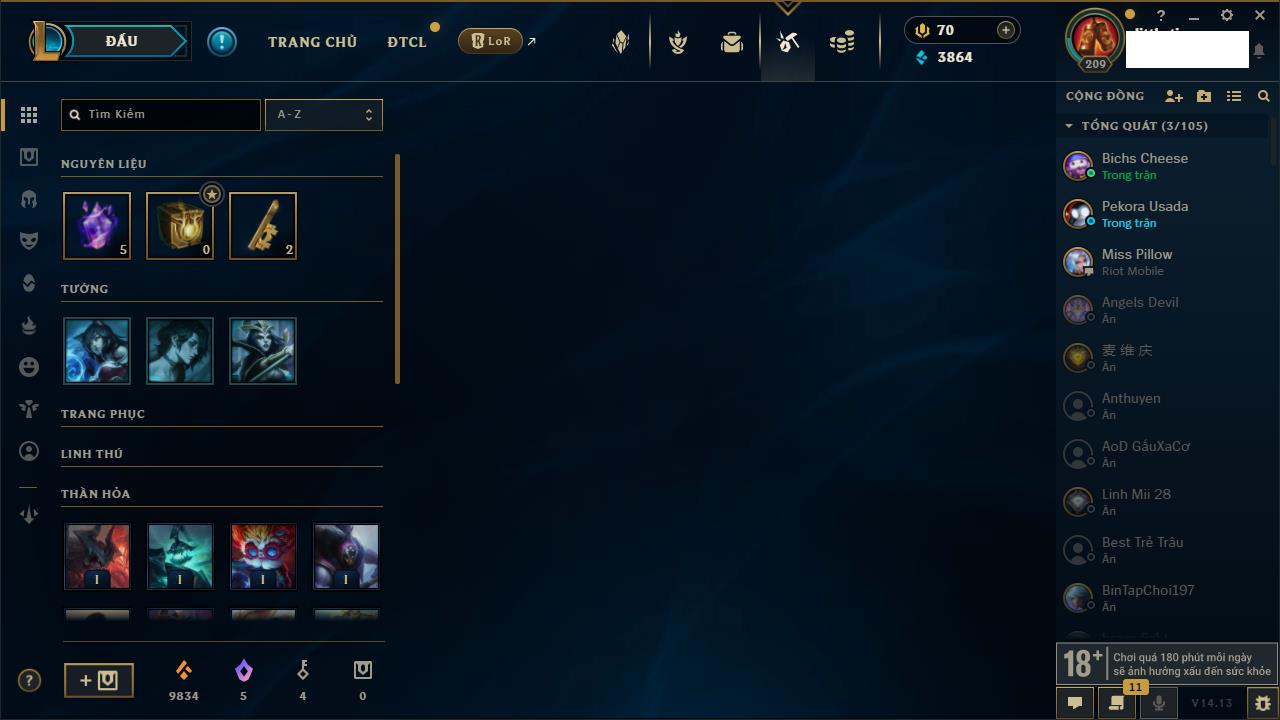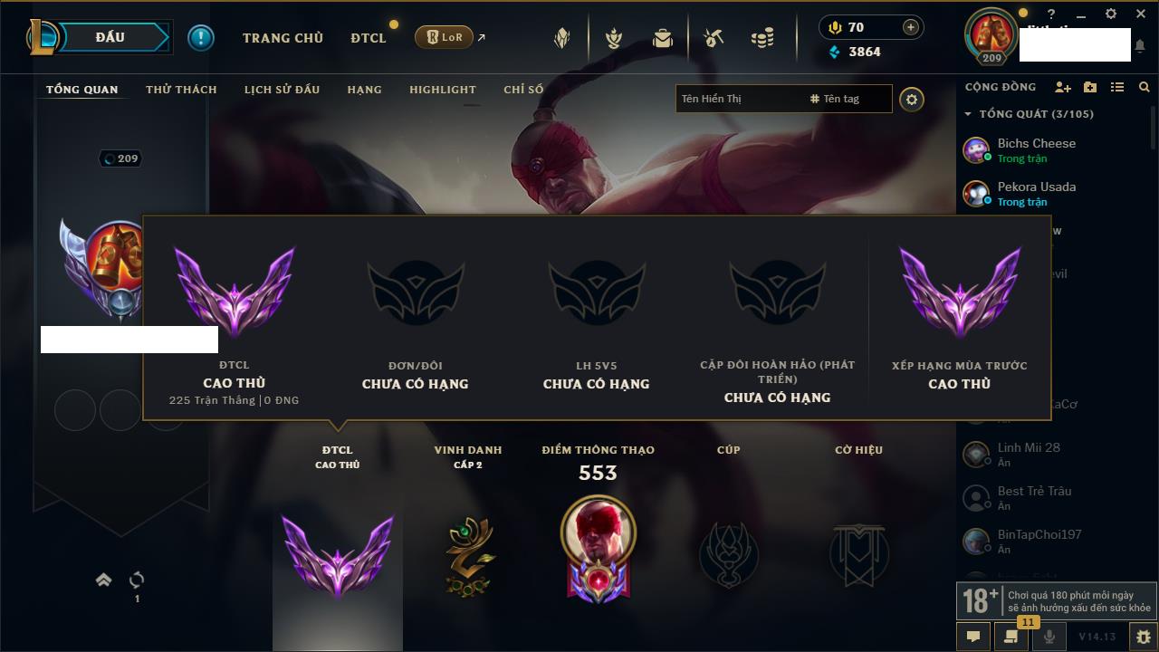 Rank Đơn: Chưa rank mùa nào Khung: Chưa có khung Tướng: 0 - Còn 2000 THX Trang Phục: 0 Rank ĐTCL: Chưa Rank Linh Thú: 14