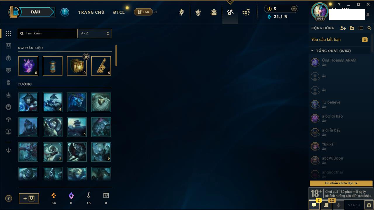 Rank Đơn: Vàng IVKhung: BạcTướng: 171 - Còn 426239 THXTrang Phục: 162Rank ĐTCL: Chưa RankLinh Thú: 33
