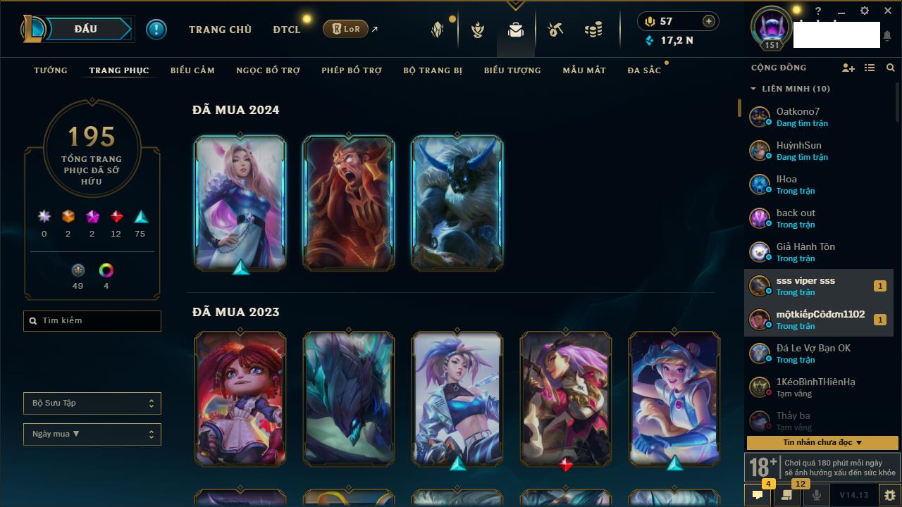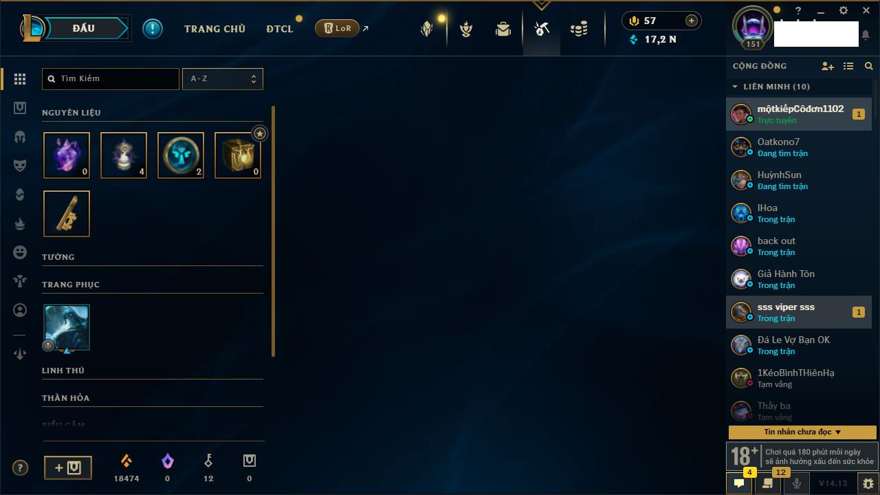 Rank Đơn: Vàng IIIKhung: BạcTướng: 171 - Còn 101359 THXTrang Phục: 88Rank ĐTCL: Kim Cương IVLinh Thú: 200