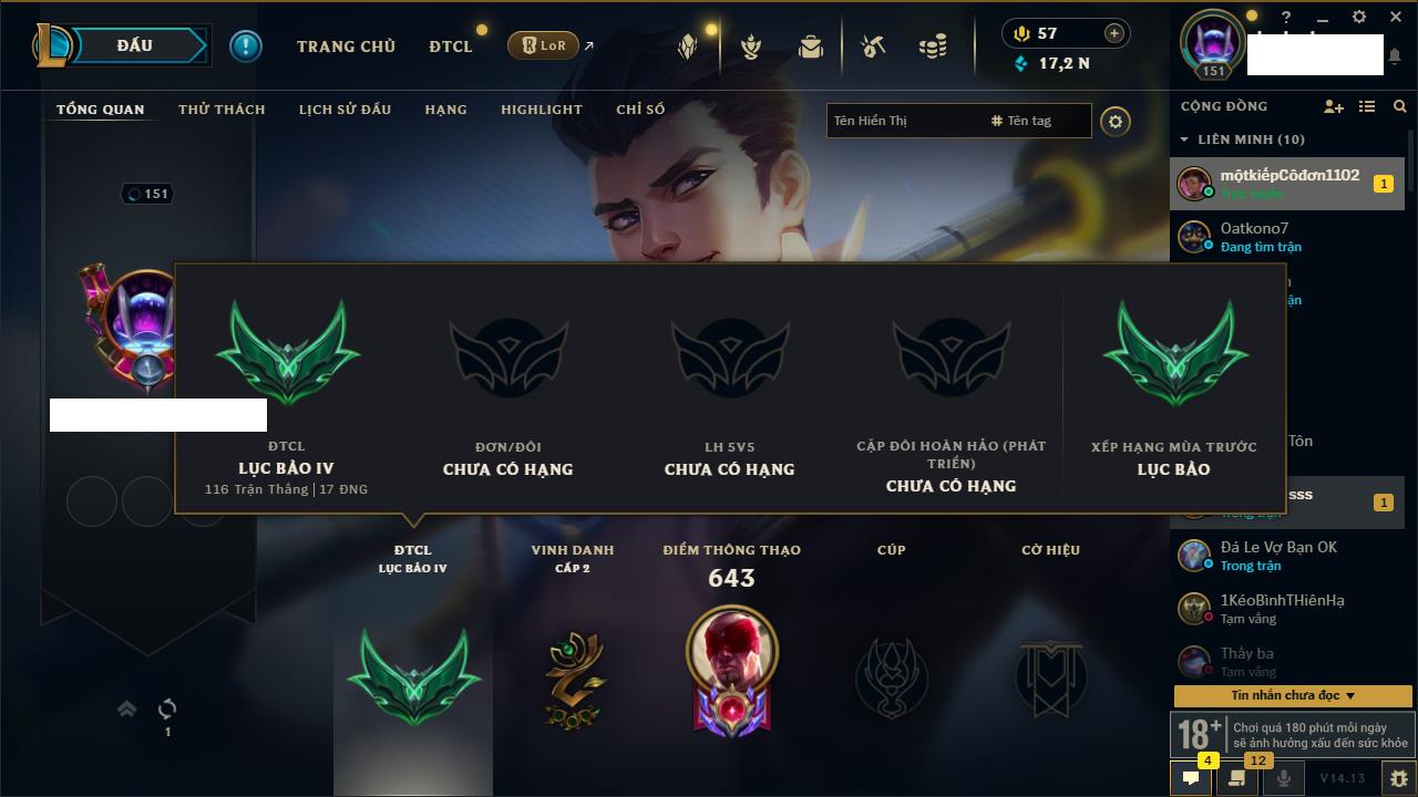 Rank Đơn: Lục Bảo IVKhung: Bạch kimTướng: 171 - Còn 128452 THXTrang Phục: 193Rank ĐTCL: Bạc IIILinh Thú: 100