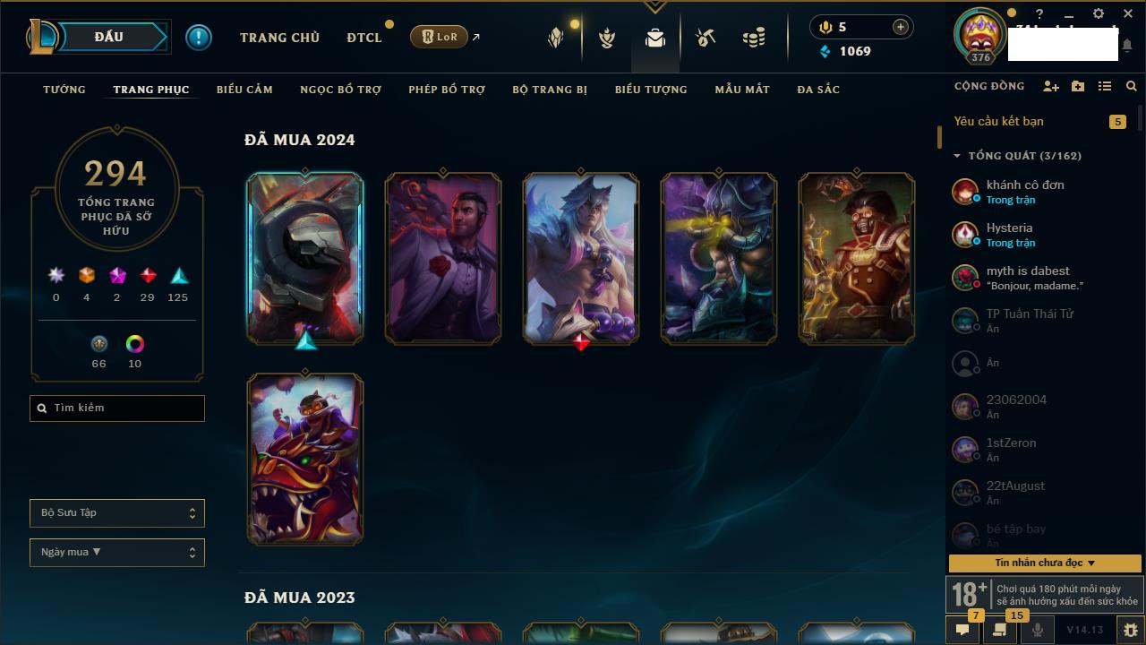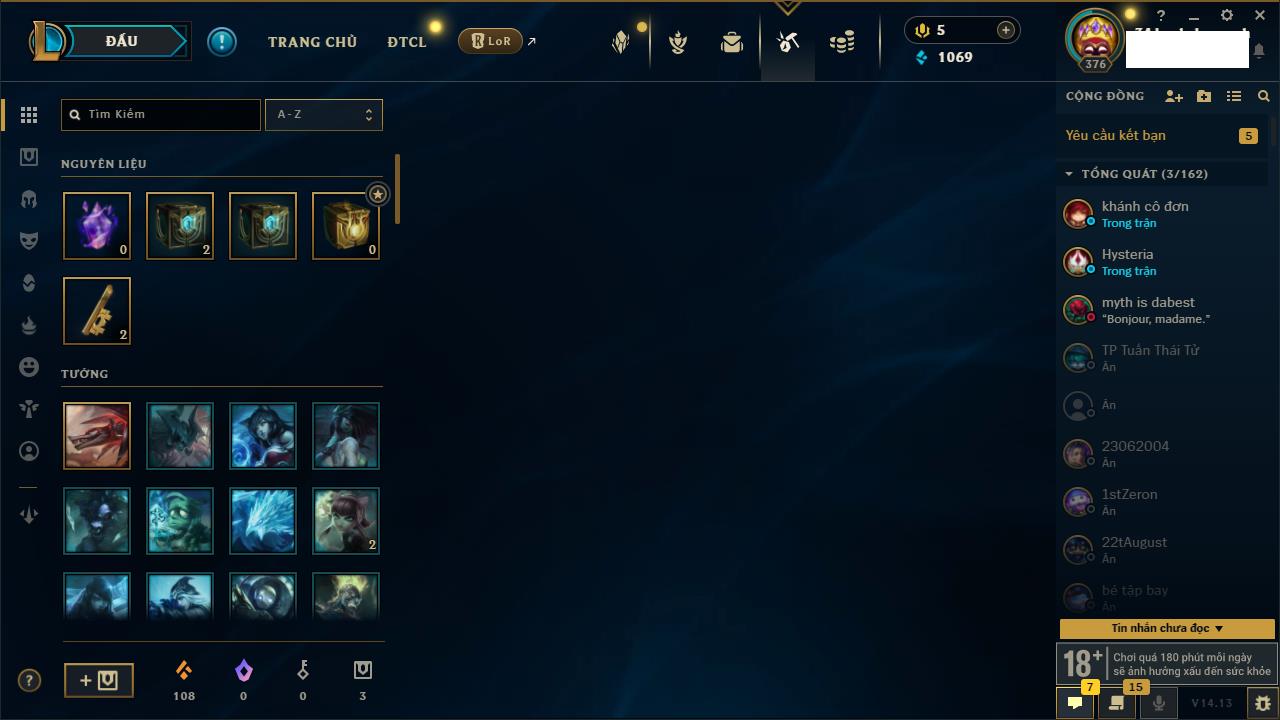 Rank Đơn: Chưa RankKhung: Chưa có khungTướng: 170 - Còn 8653 THXTrang Phục: 276Rank ĐTCL: Chưa RankLinh Thú: 193