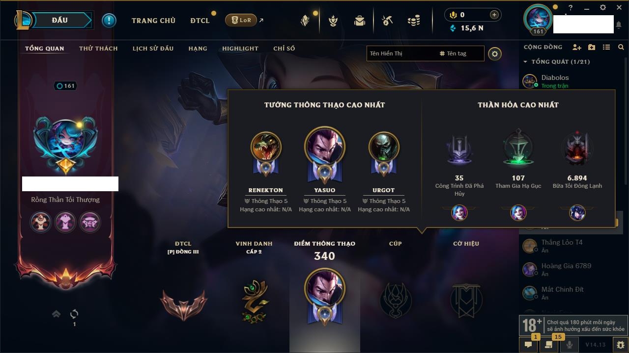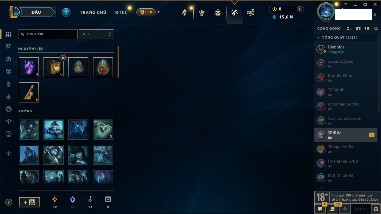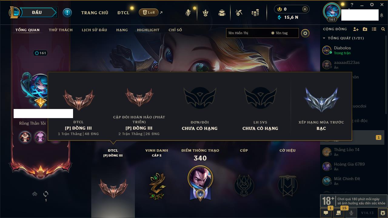 Rank Đơn: Vàng IKhung: BạcTướng: 171 - Còn 60584 THXTrang Phục: 286Rank ĐTCL: Vàng IIILinh Thú: 117