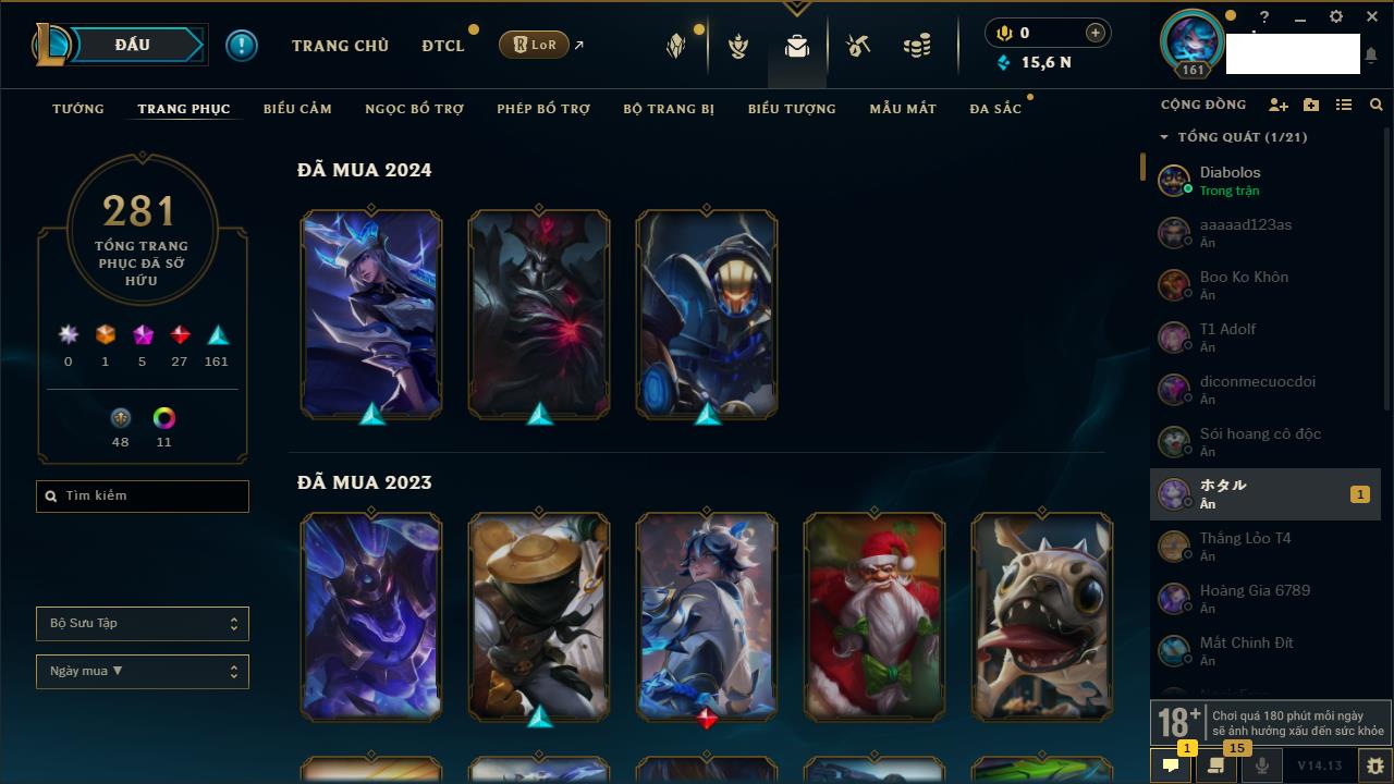 Rank Đơn: Vàng IIIKhung: VàngTướng: 171 - Còn 88128 THXTrang Phục: 329Rank ĐTCL: Chưa RankLinh Thú: 41