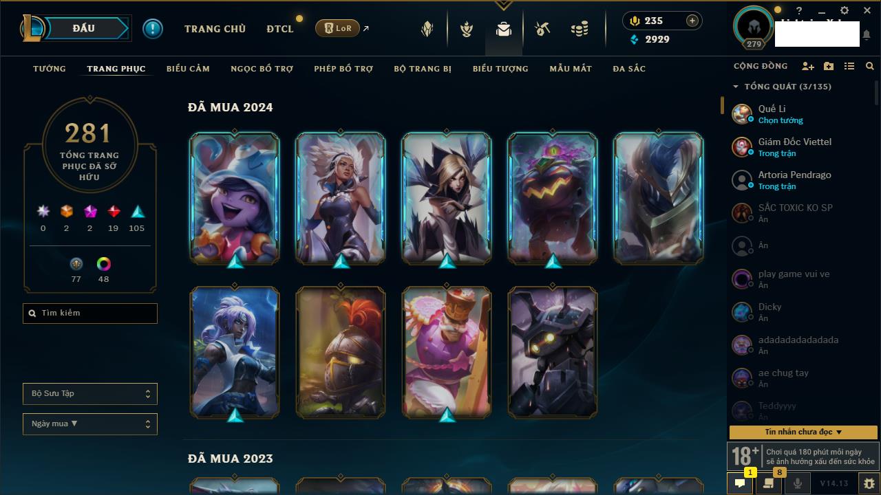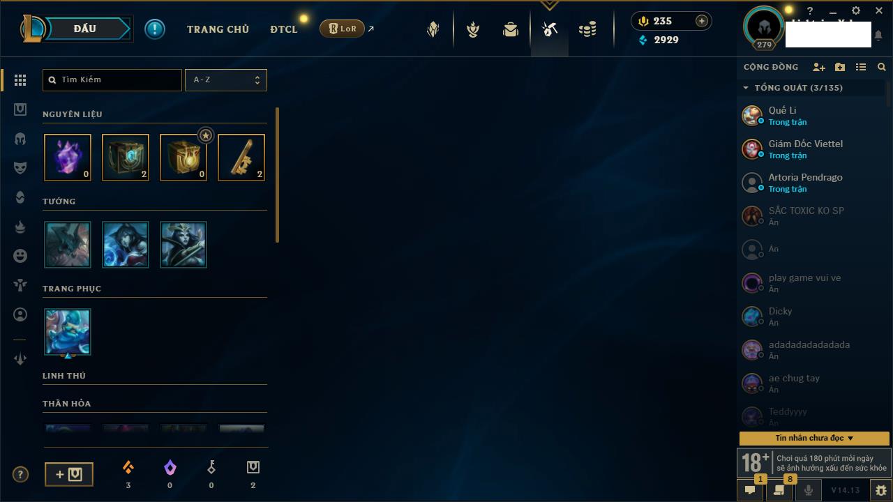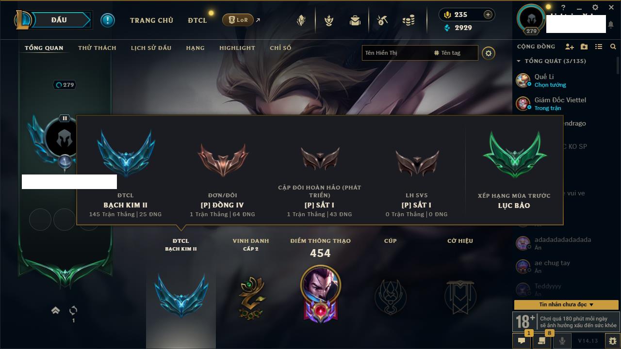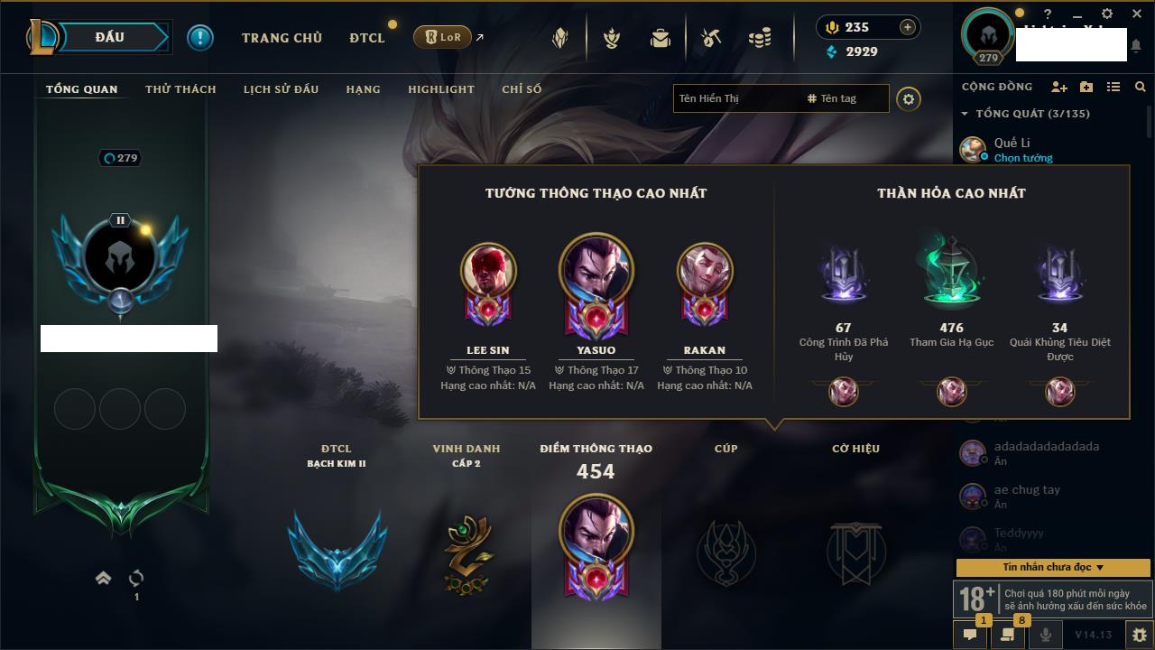 Rank Đơn: Bạch Kim IIKhung: Bạch kimTướng: 171 - Còn 316137 THXTrang Phục: 89Rank ĐTCL: Bạch Kim IIILinh Thú: 94