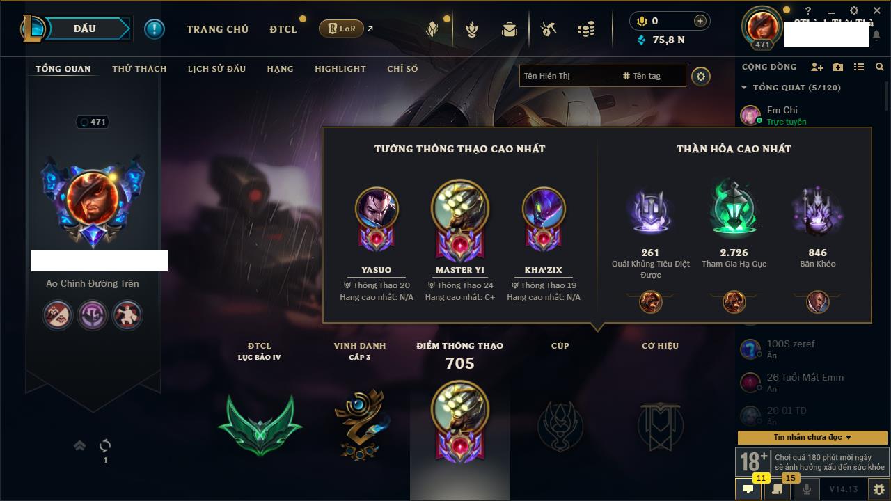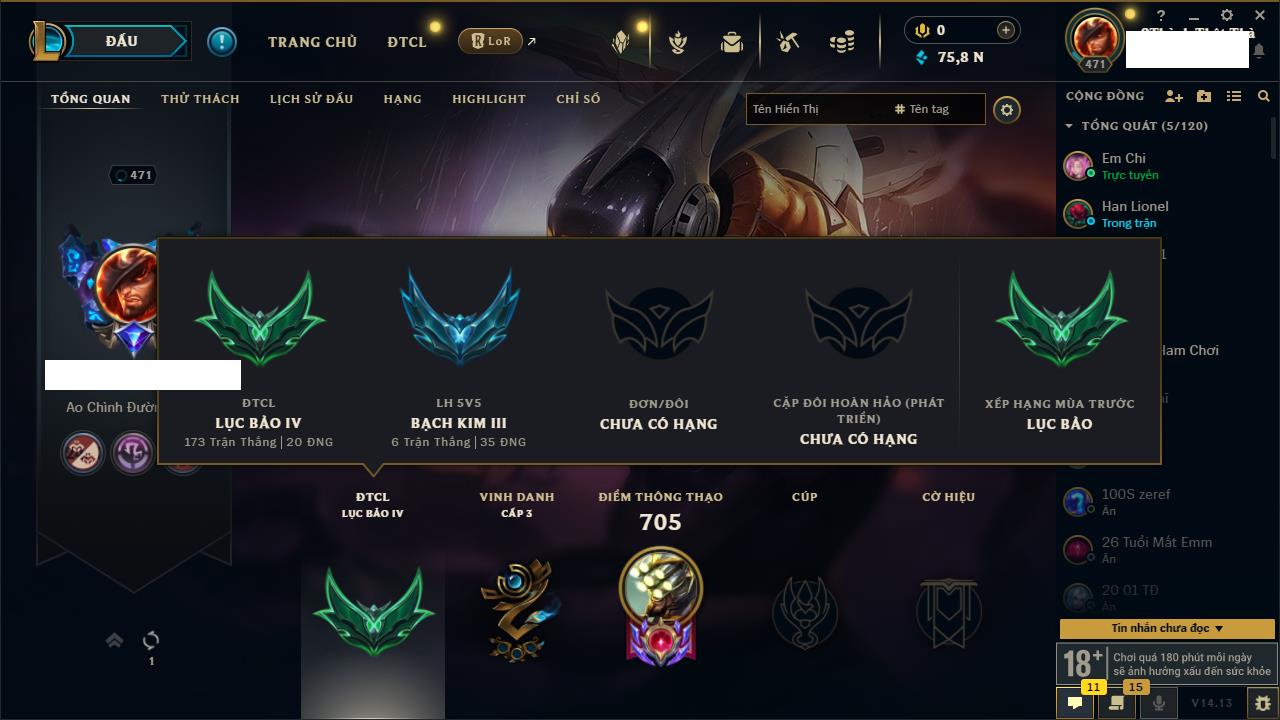 Rank Đơn: Bạc IIKhung: VàngTướng: 171 - Còn 332462 THXTrang Phục: 165Rank ĐTCL: Kim Cương IVLinh Thú: 181