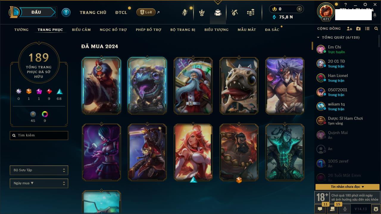 Rank Đơn: Vàng IVKhung: VàngTướng: 171 - Còn 48721 THXTrang Phục: 171Rank ĐTCL: Chưa RankLinh Thú: 27