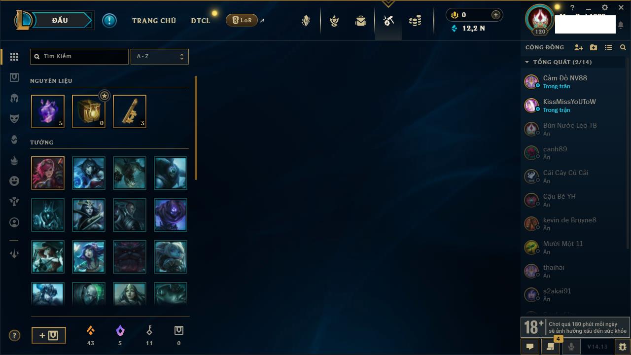 Rank Đơn: Bạch Kim IIKhung: Bạch kimTướng: 171 - Còn 97913 THXTrang Phục: 261Rank ĐTCL: Chưa RankLinh Thú: 46
