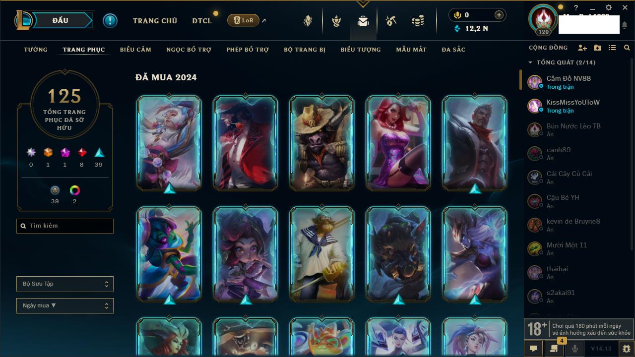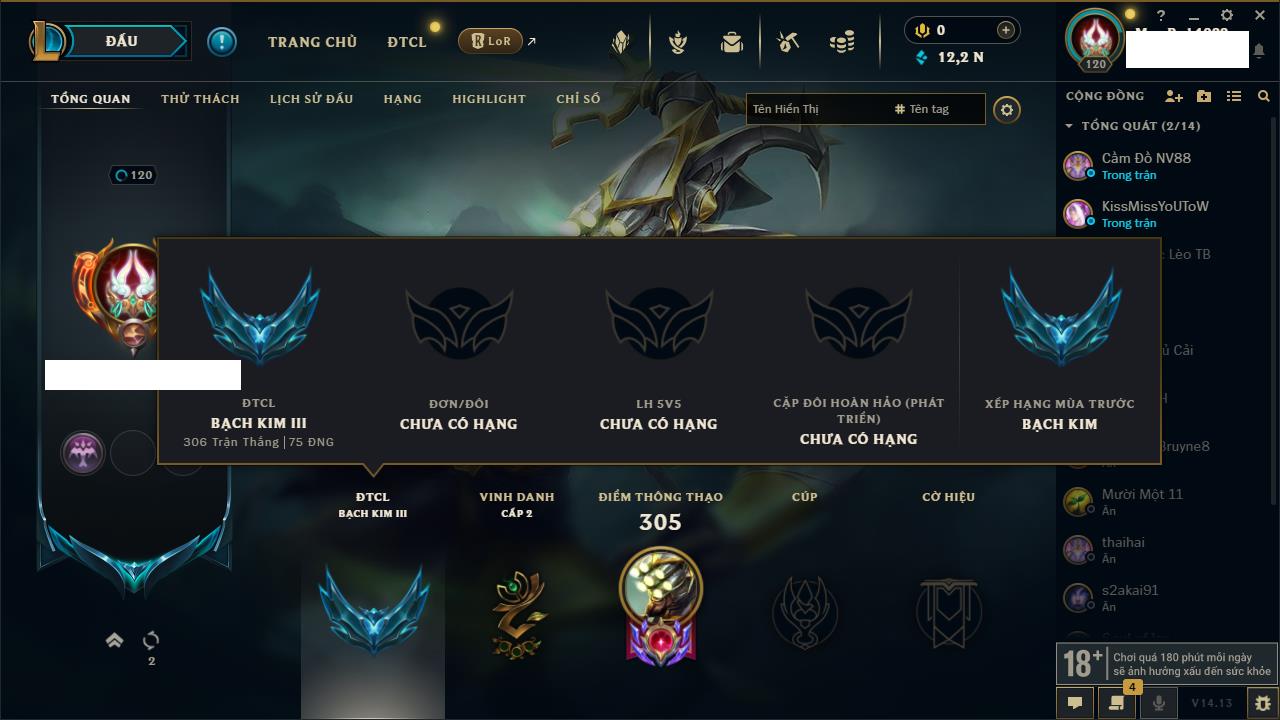 Rank Đơn: Bạch Kim IIKhung: Bạch kimTướng: 171 - Còn 316137 THXTrang Phục: 89Rank ĐTCL: Bạch Kim IIILinh Thú: 94