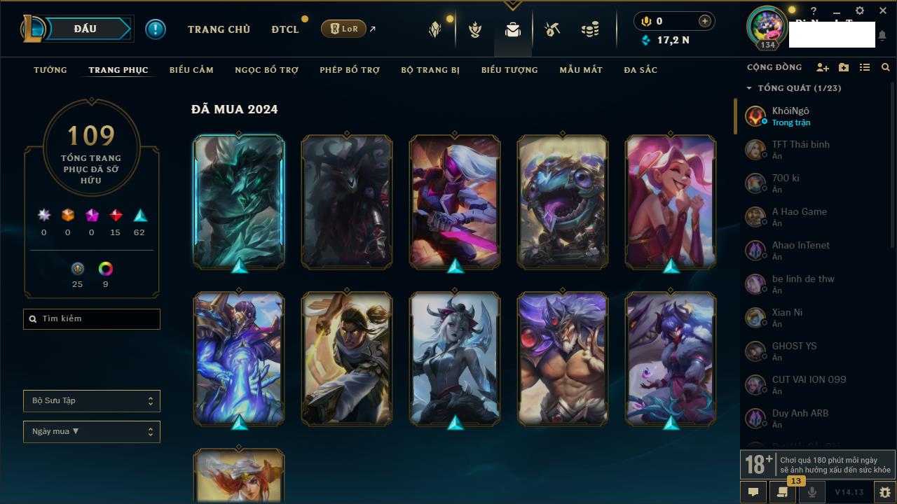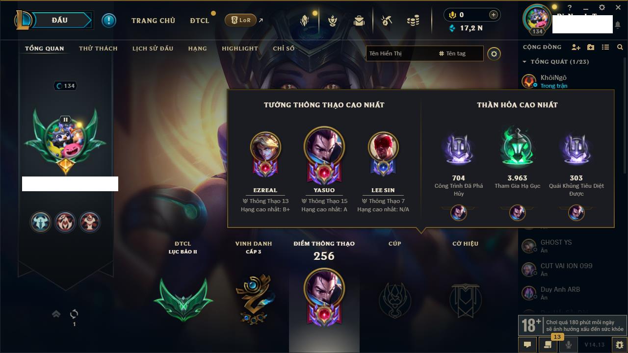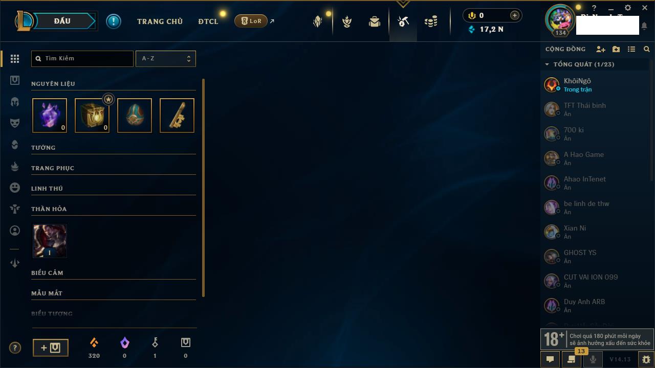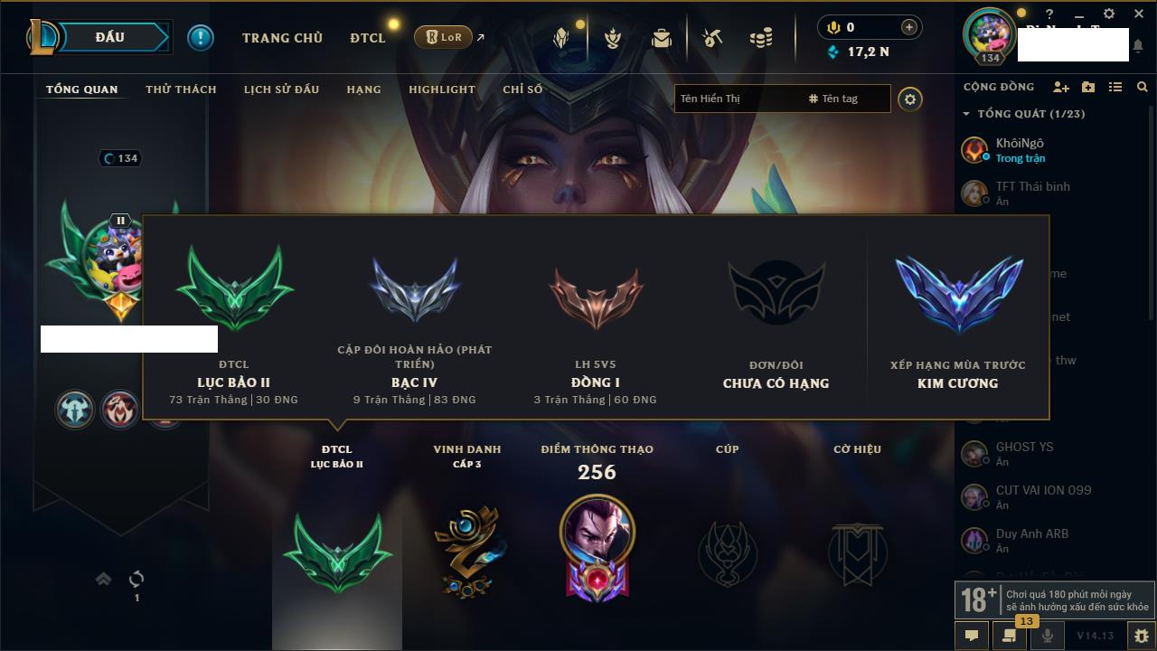 Rank Đơn: Đồng IIKhung: Chưa có khungTướng: 170 - Còn 56487 THXTrang Phục: 90Rank ĐTCL: Chưa RankLinh Thú: 129