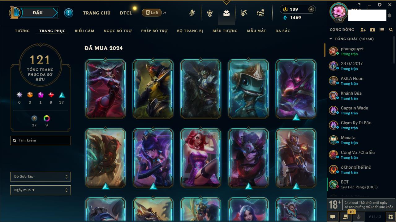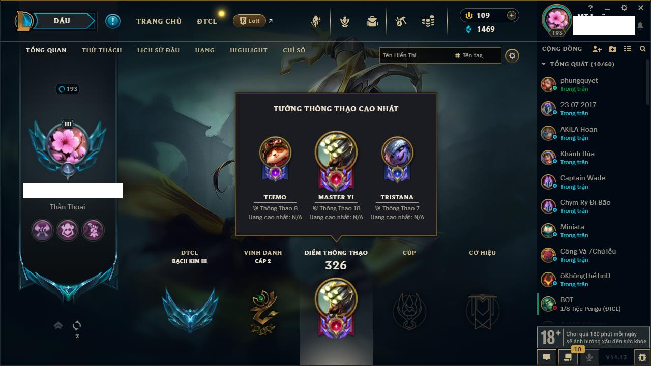 Rank Đơn: Bạch Kim IIKhung: Bạch kimTướng: 171 - Còn 316137 THXTrang Phục: 89Rank ĐTCL: Bạch Kim IIILinh Thú: 94