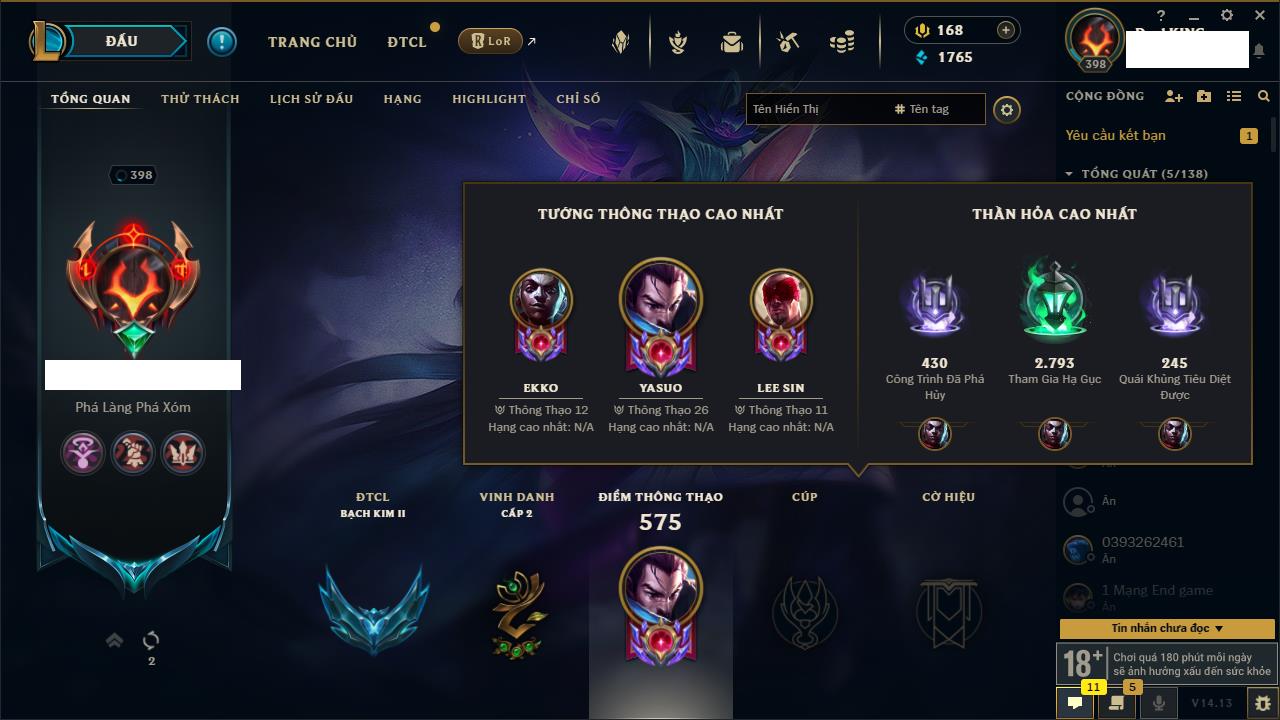 Rank Đơn: Bạch Kim IVKhung: VàngTướng: 171 - Còn 130578 THXTrang Phục: 253Rank ĐTCL: Chưa RankLinh Thú: 20