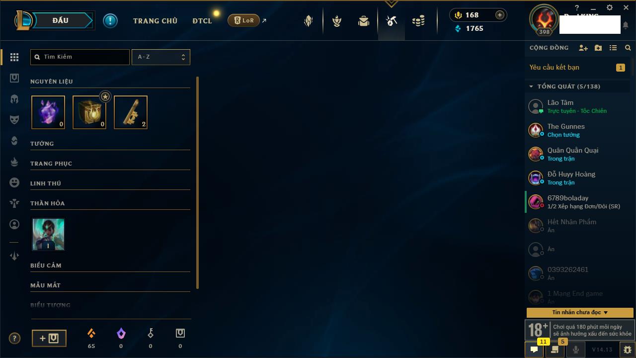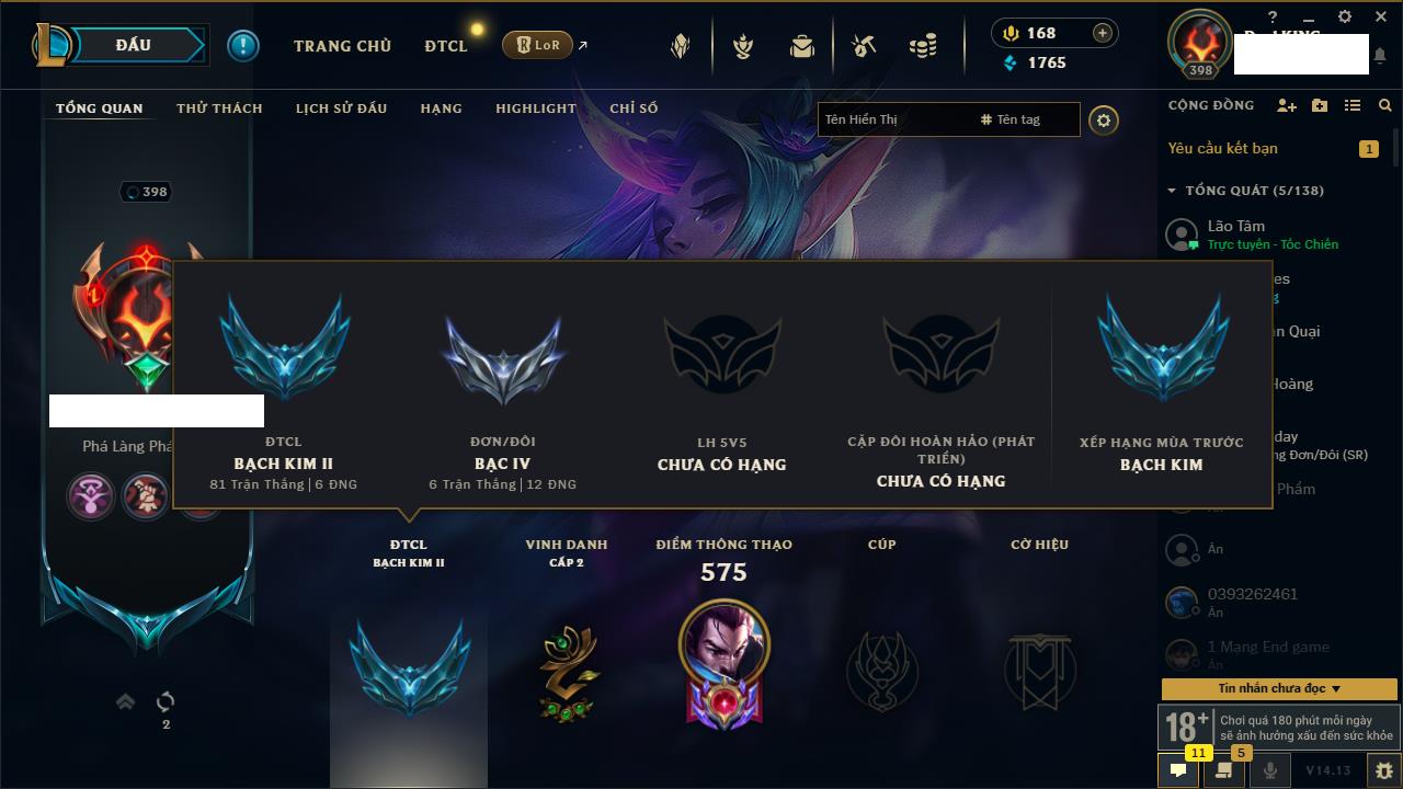 Rank Đơn: Bạch Kim IVKhung: VàngTướng: 171 - Còn 130280 THXTrang Phục: 226Rank ĐTCL: Kim Cương IVLinh Thú: 183