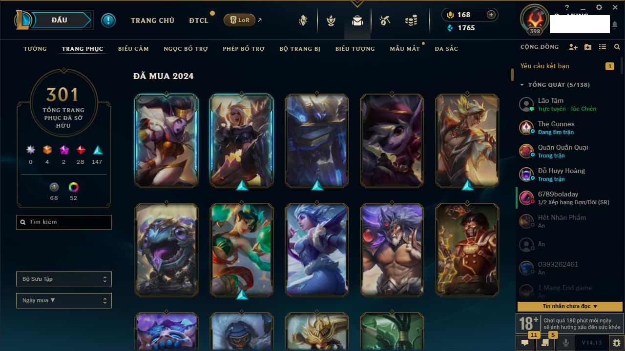 Rank Đơn: Vàng IIIKhung: Bạch kimTướng: 171 - Còn 98230 THXTrang Phục: 235Rank ĐTCL: Vàng IVLinh Thú: 59
