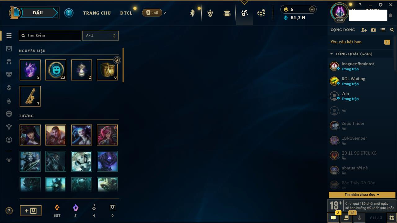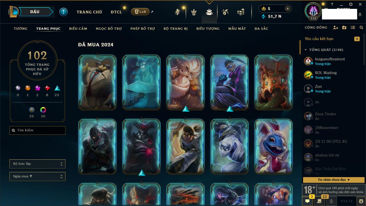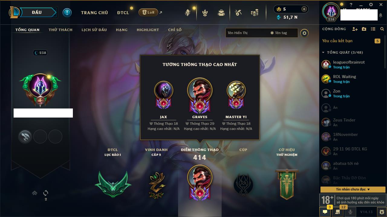 Rank Đơn: Vàng IVKhung: VàngTướng: 171 - Còn 48721 THXTrang Phục: 171Rank ĐTCL: Chưa RankLinh Thú: 27