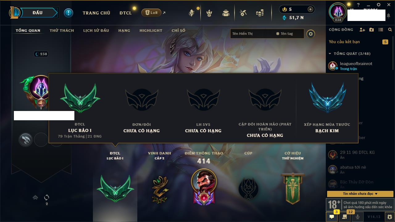 Rank Đơn: Bạc IIKhung: VàngTướng: 171 - Còn 332462 THXTrang Phục: 165Rank ĐTCL: Kim Cương IVLinh Thú: 181