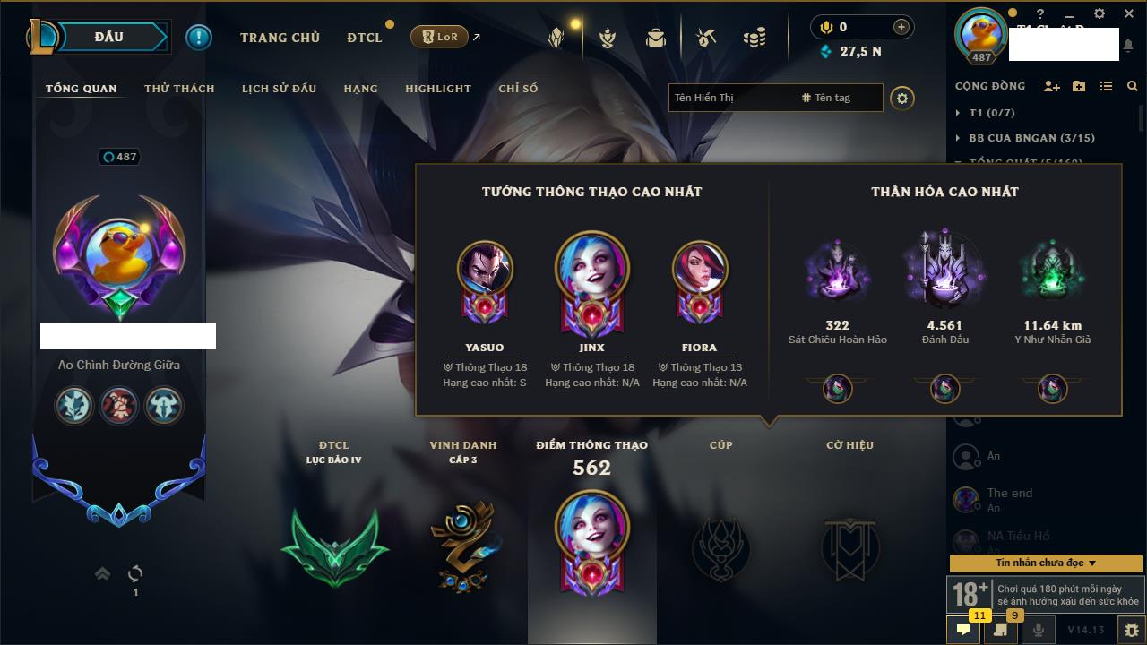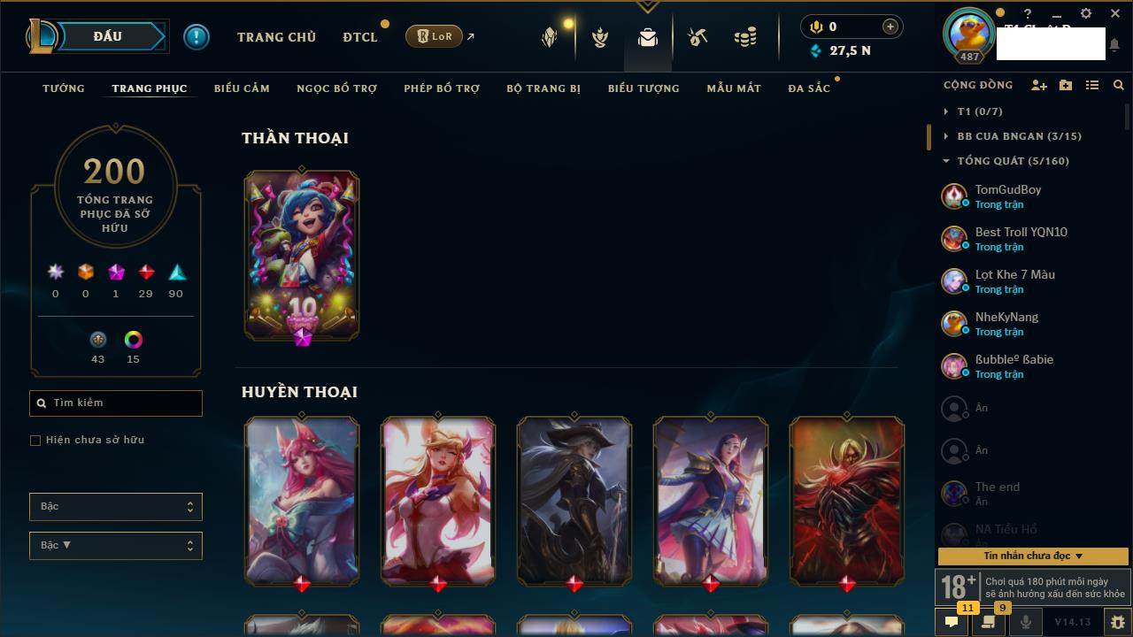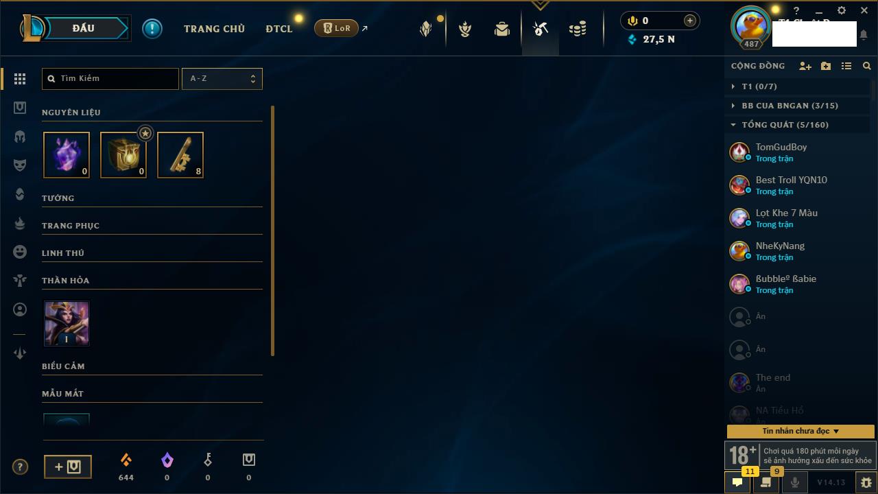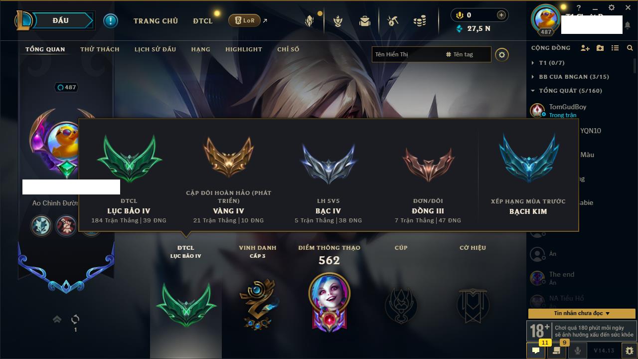 Rank Đơn: Vàng IVKhung: VàngTướng: 171 - Còn 48721 THXTrang Phục: 171Rank ĐTCL: Chưa RankLinh Thú: 27