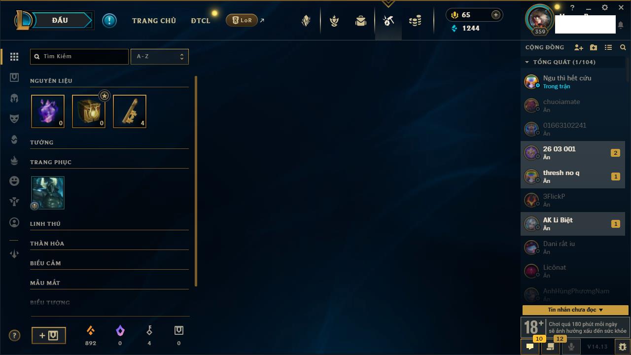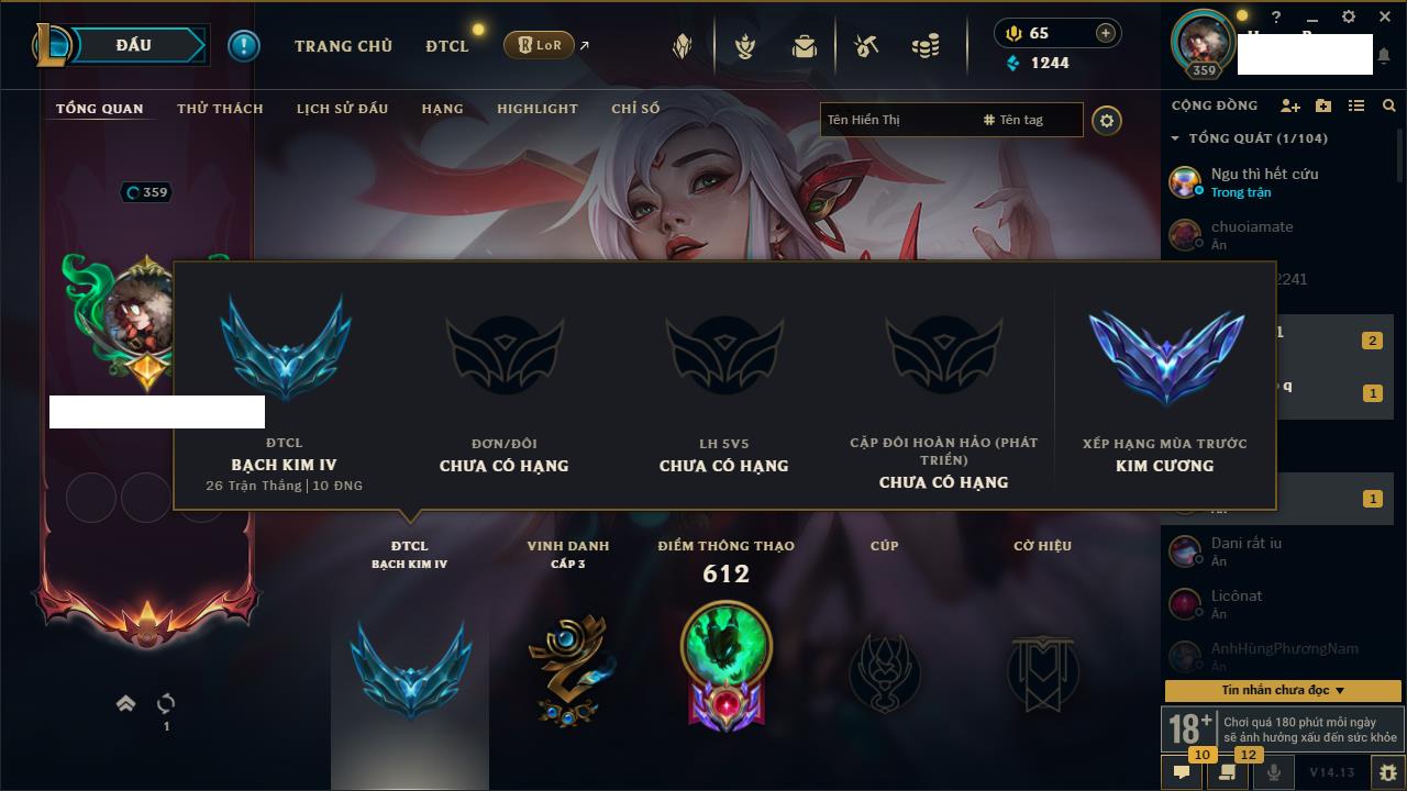 Rank Đơn: Lục Bảo IVKhung: VàngTướng: 171 - Còn 154648 THXTrang Phục: 203Rank ĐTCL: Bạch Kim IVLinh Thú: 69