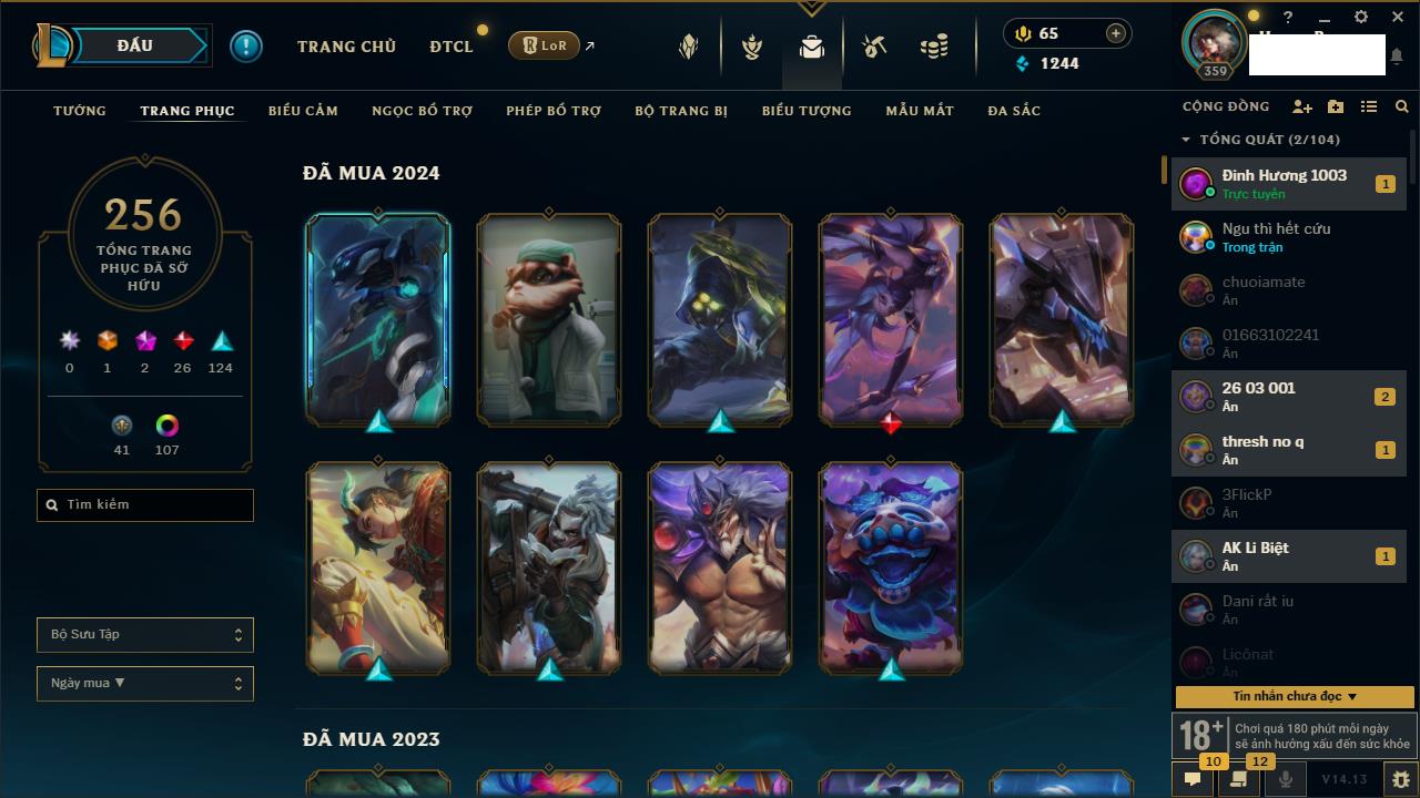 Rank Đơn: Vàng IIKhung: VàngTướng: 170 - Còn 243330 THXTrang Phục: 230Rank ĐTCL: Chưa RankLinh Thú: 68