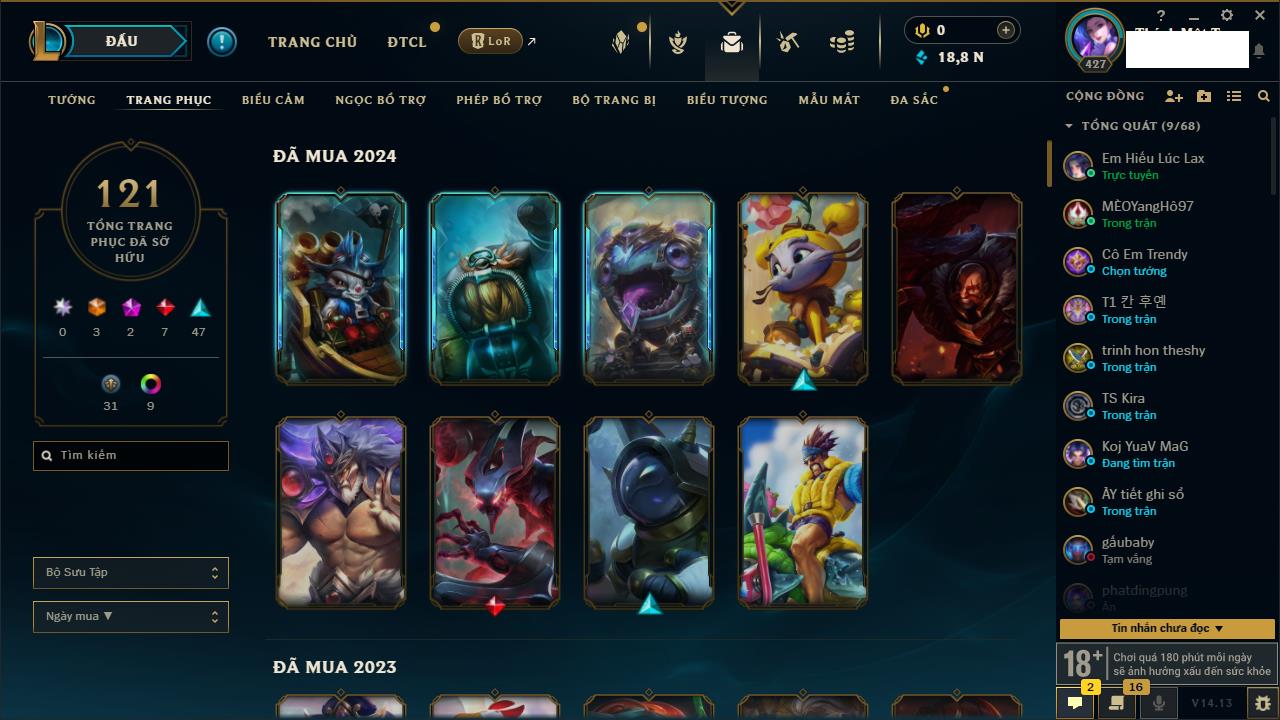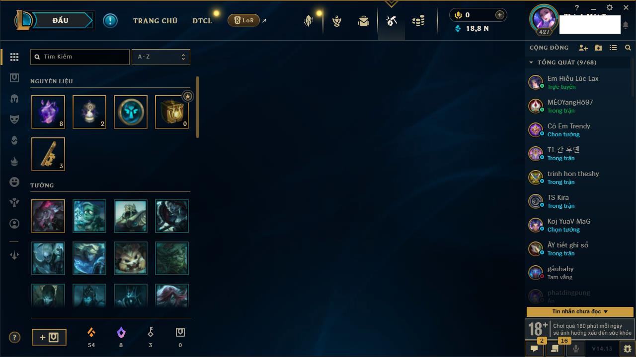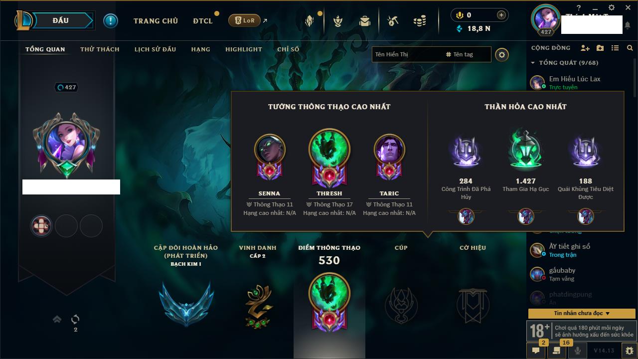 Rank Đơn: Chưa RankKhung: Chưa có khungTướng: 154 - Còn 18477 THXTrang Phục: 127Rank ĐTCL: Vàng ILinh Thú: 183