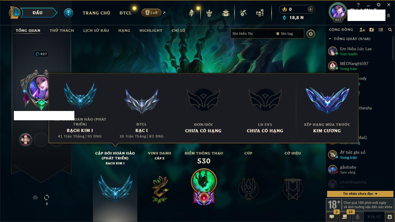 Rank Đơn: Chưa RankKhung: BạcTướng: 141 - Còn 299 THXTrang Phục: 101Rank ĐTCL: Chưa RankLinh Thú: 84