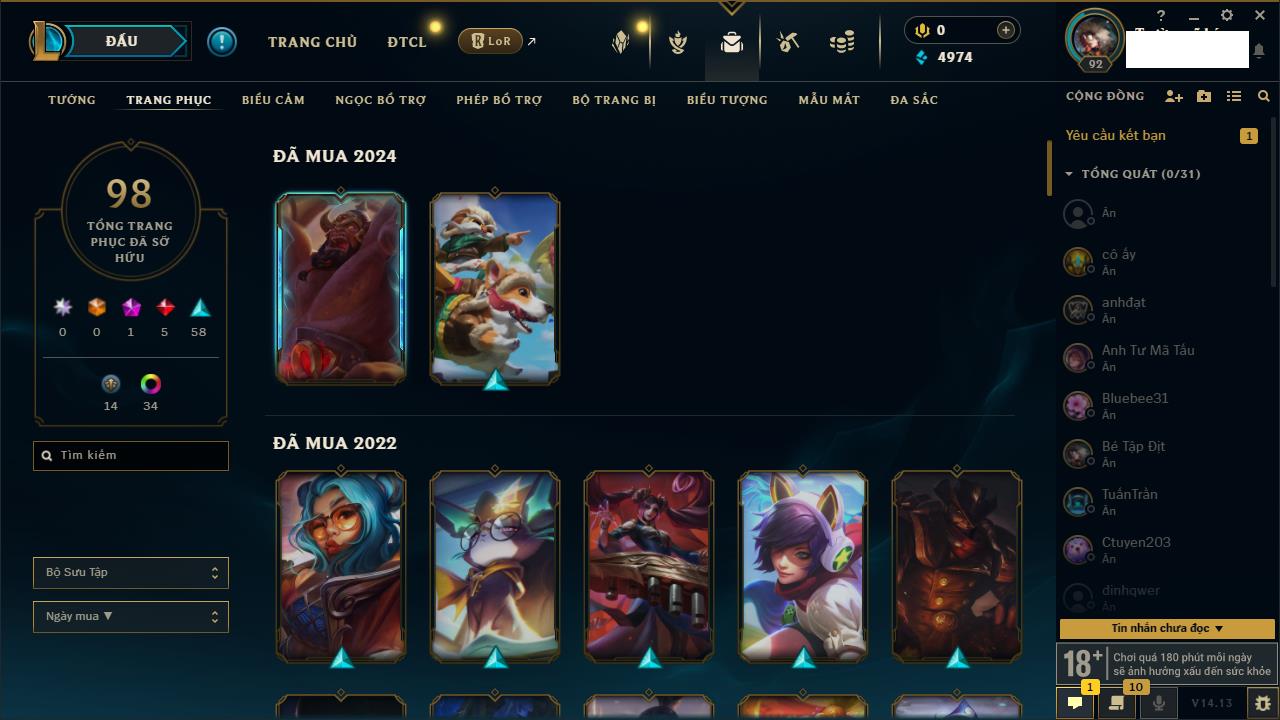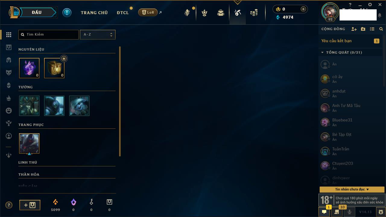 Rank Đơn: Bạc IIKhung: Bạch kimTướng: 169 - Còn 81813 THXTrang Phục: 301Rank ĐTCL: Chưa RankLinh Thú: 140