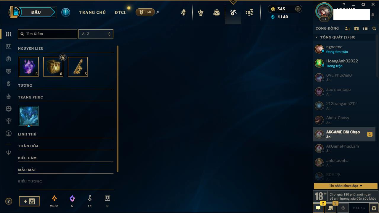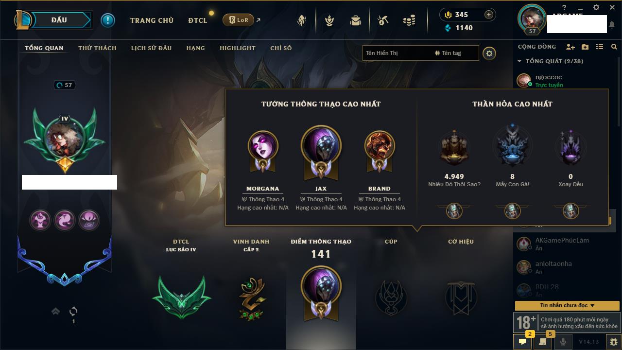 Rank Đơn: Chưa RankKhung: Chưa có khungTướng: 37 - Còn 27387 THXTrang Phục: 10Rank ĐTCL: Chưa RankLinh Thú: 1