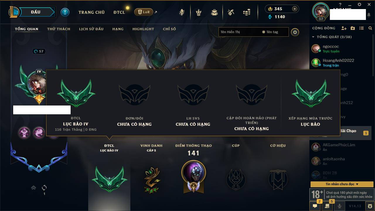 Rank Đơn: Chưa RankKhung: Chưa có khungTướng: 118 - Còn 13712 THXTrang Phục: 117Rank ĐTCL: Chưa RankLinh Thú: 34