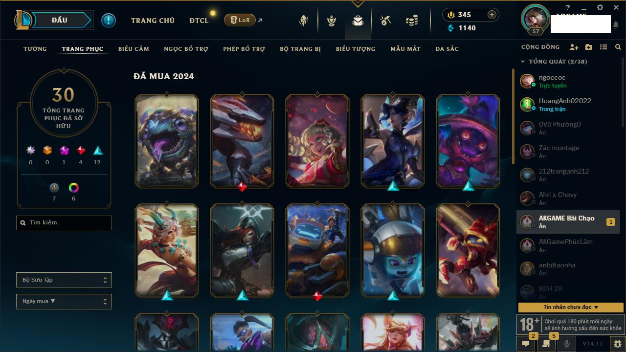 Rank Đơn: Chưa RankKhung: Chưa có khungTướng: 165 - Còn 3214 THXTrang Phục: 160Rank ĐTCL: Chưa RankLinh Thú: 28