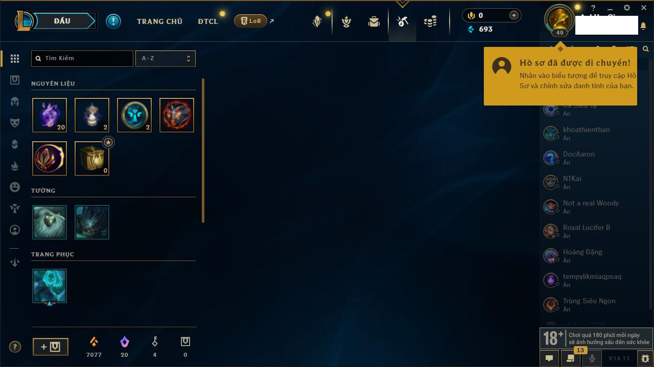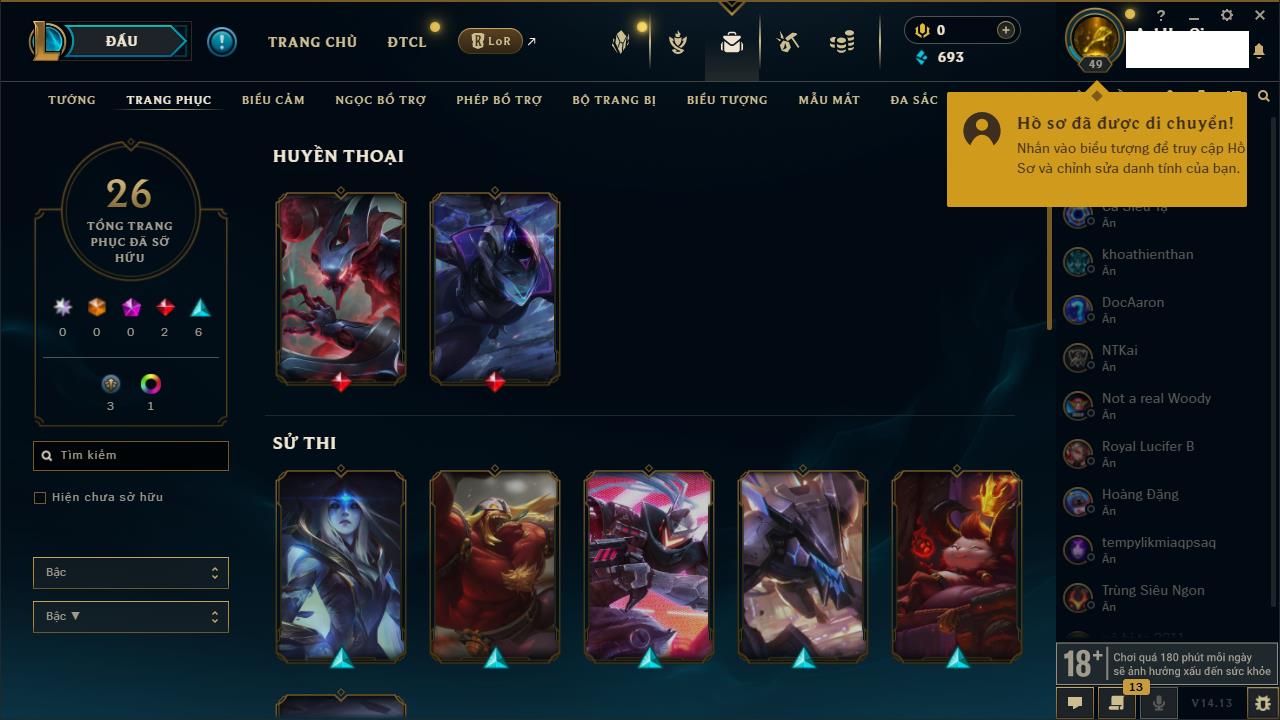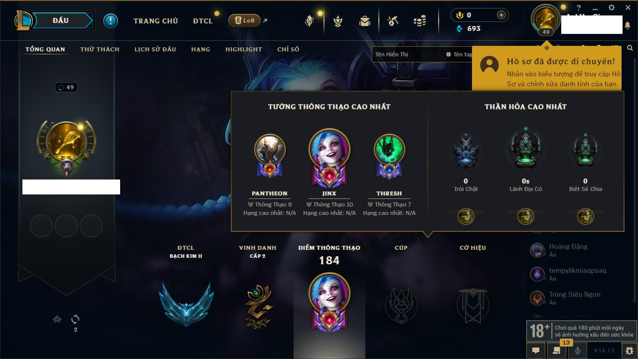 Rank Đơn: Vàng IVKhung: BạcTướng: 166 - Còn 180925 THXTrang Phục: 163Rank ĐTCL: Chưa RankLinh Thú: 67