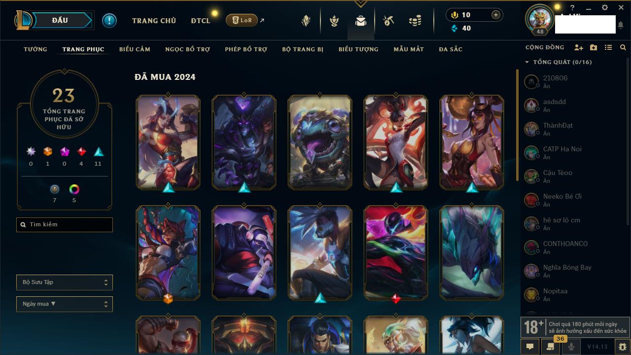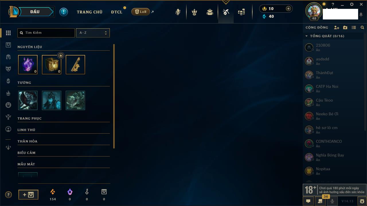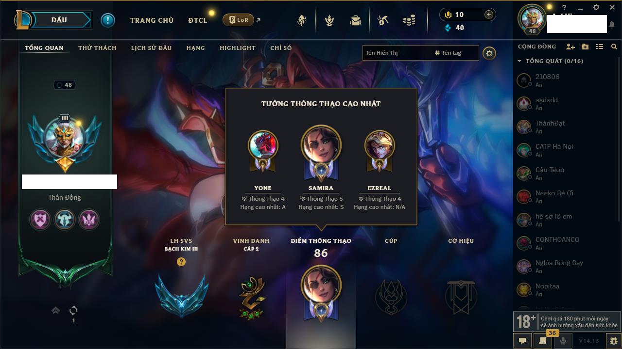 Rank Đơn: Đồng IIKhung: Chưa có khungTướng: 170 - Còn 56487 THXTrang Phục: 90Rank ĐTCL: Chưa RankLinh Thú: 129