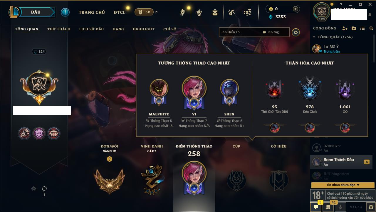 Rank Đơn: Bạc IVKhung: VàngTướng: 172 - Còn 358384 THXTrang Phục: 177Rank ĐTCL: Lục Bảo IILinh Thú: 211