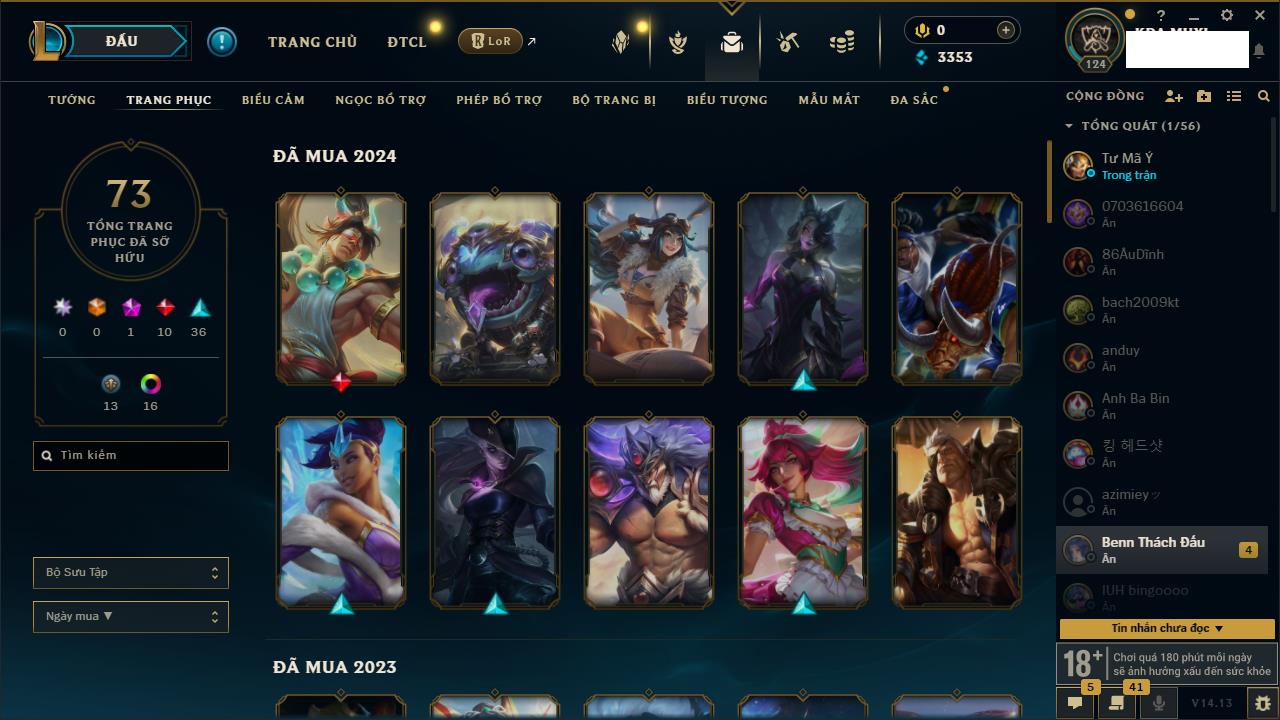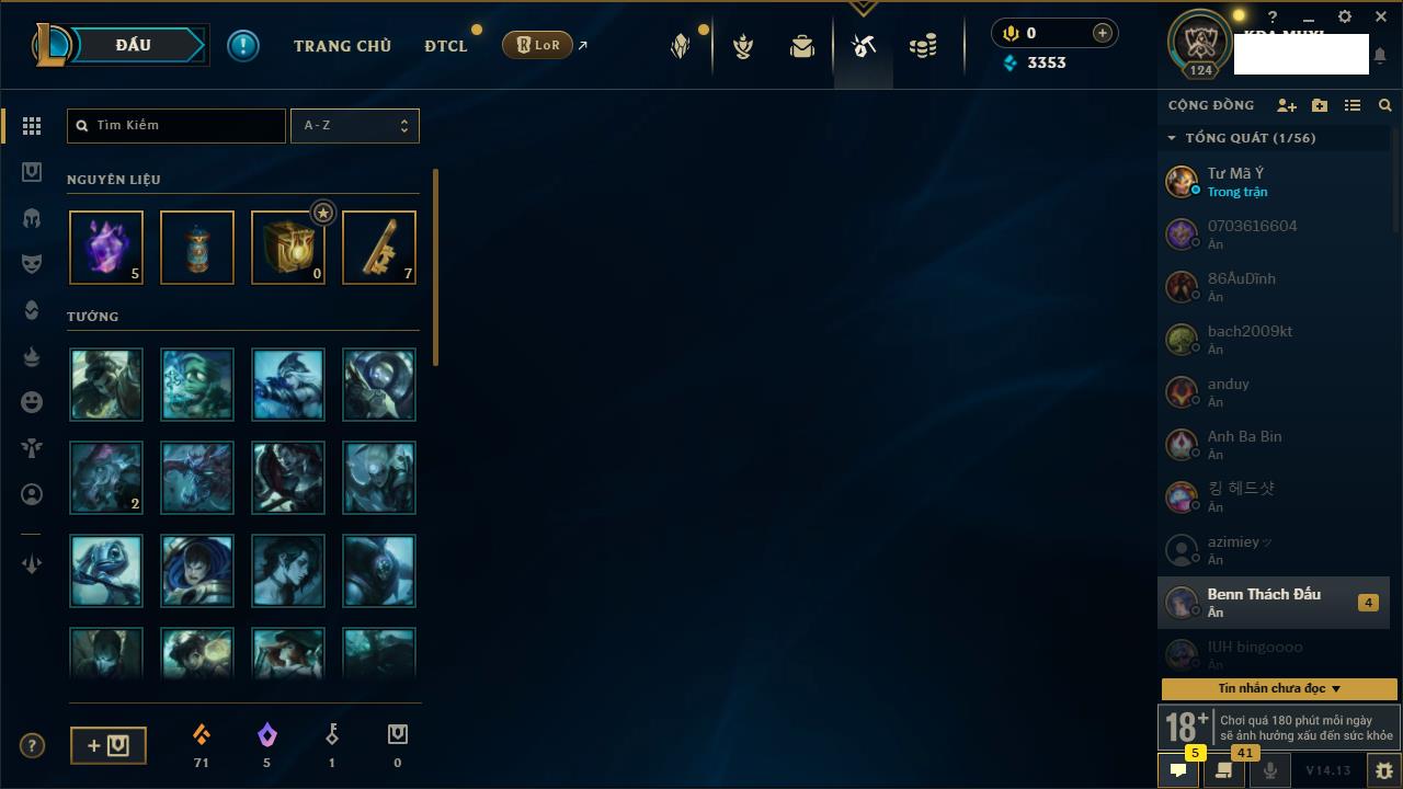 Rank Đơn: Vàng IVKhung: VàngTướng: 171 - Còn 48721 THXTrang Phục: 171Rank ĐTCL: Chưa RankLinh Thú: 27