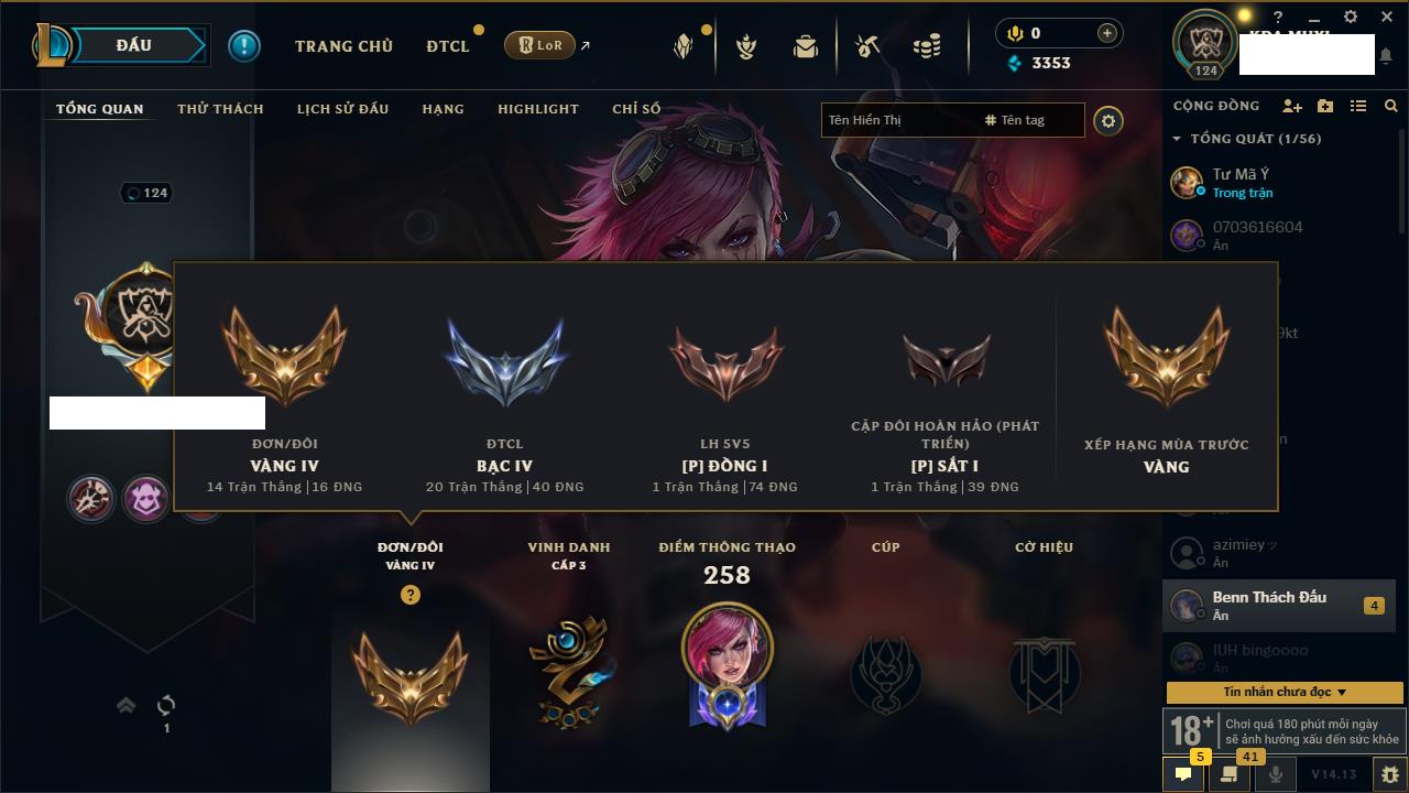 Rank Đơn: Bạc IIKhung: VàngTướng: 171 - Còn 332462 THXTrang Phục: 165Rank ĐTCL: Kim Cương IVLinh Thú: 181