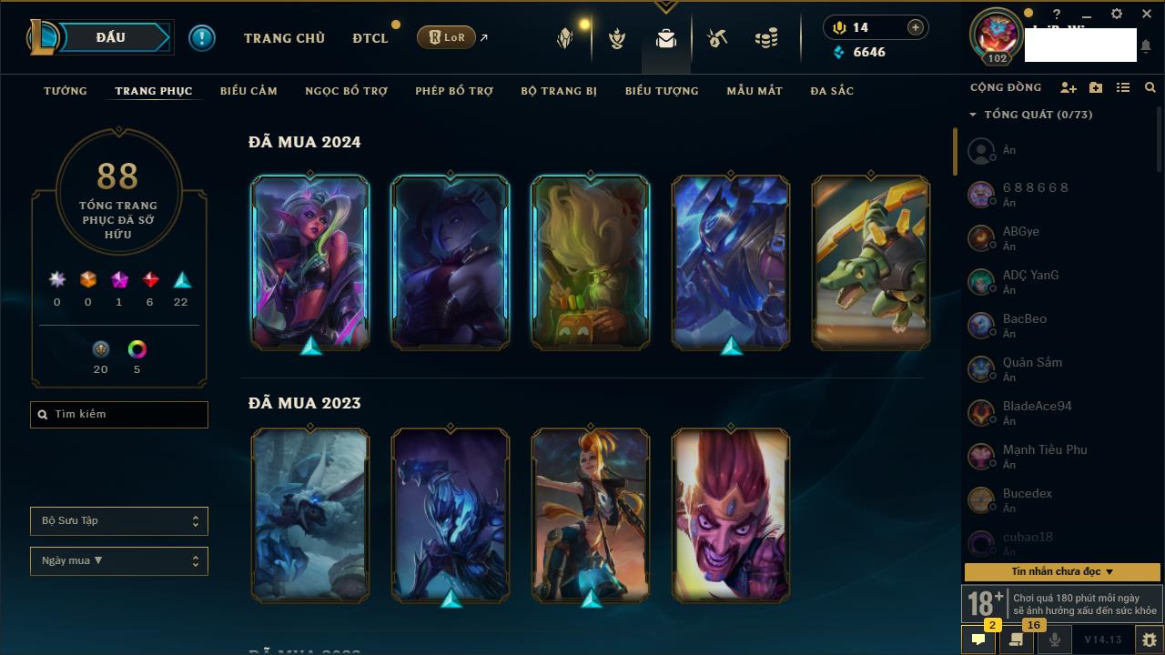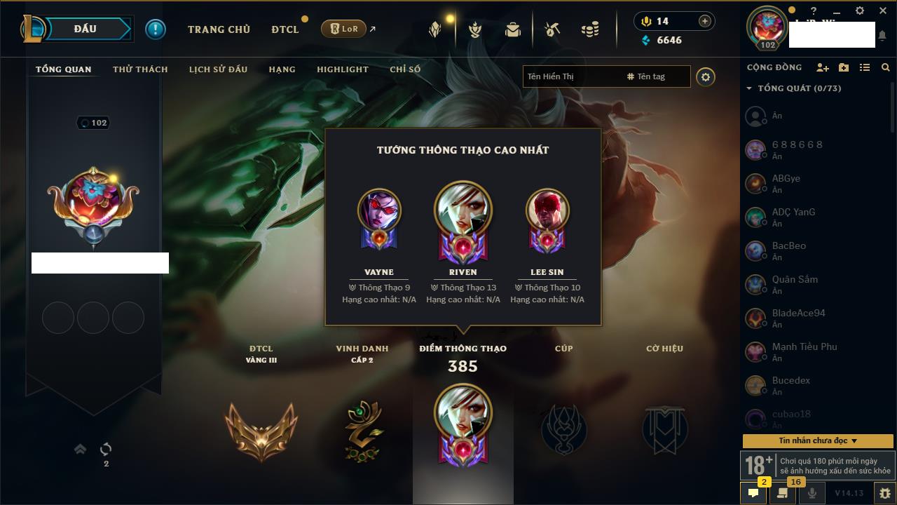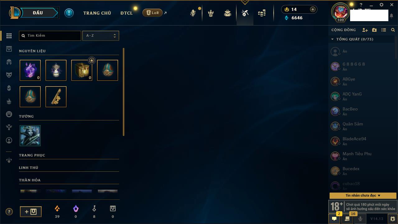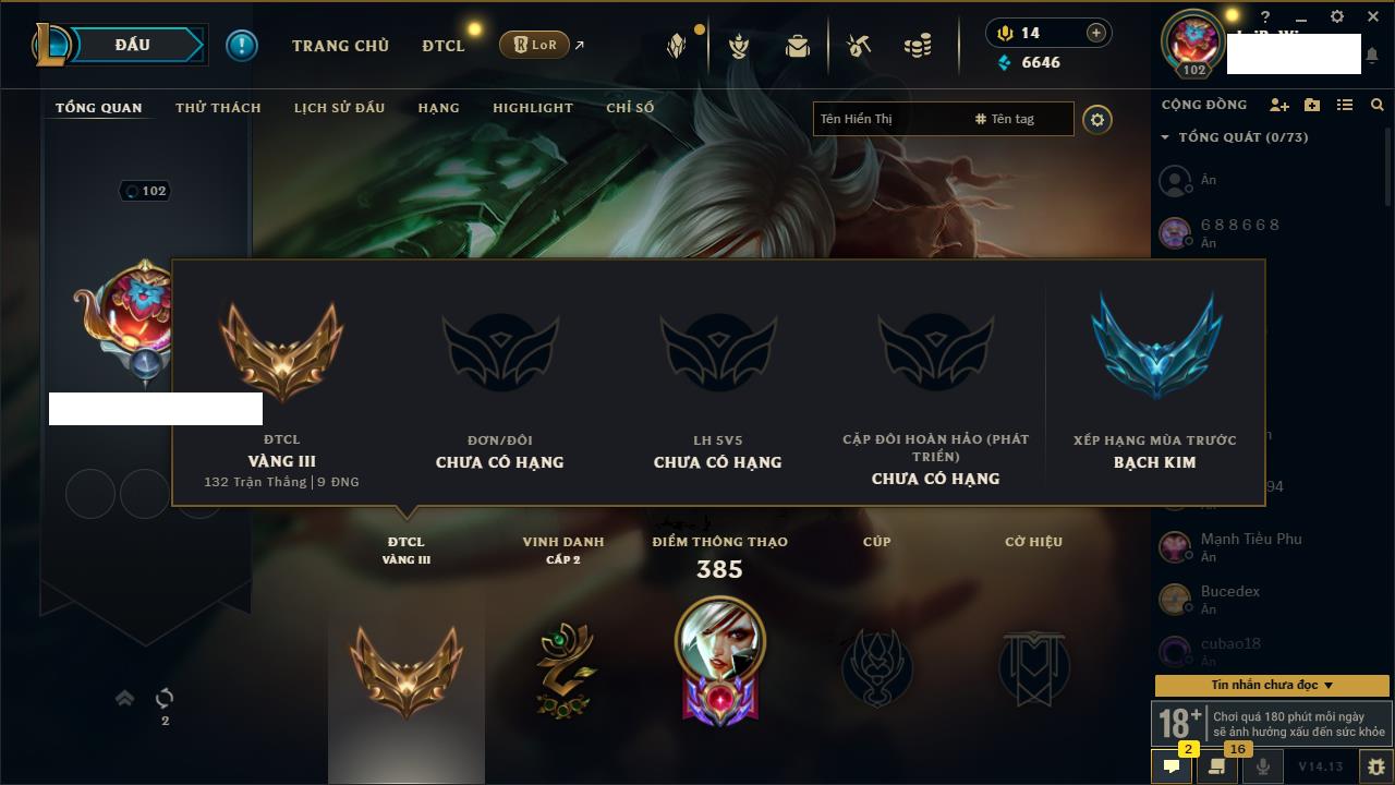 Rank Đơn: Vàng IVKhung: BạcTướng: 171 - Còn 426239 THXTrang Phục: 162Rank ĐTCL: Chưa RankLinh Thú: 33