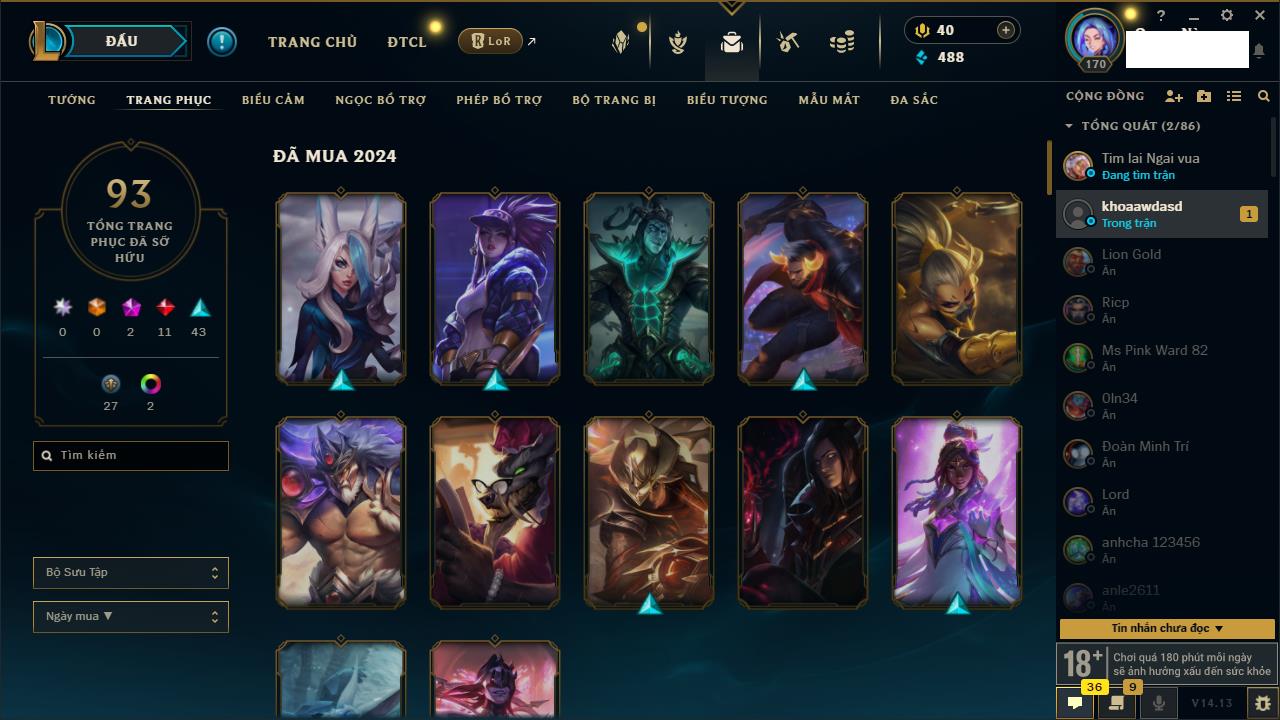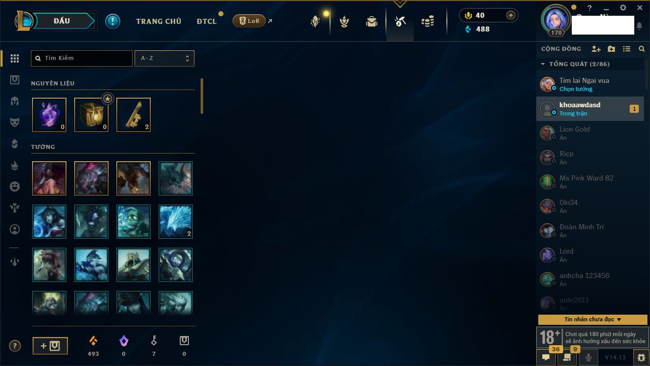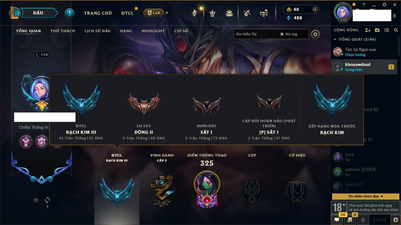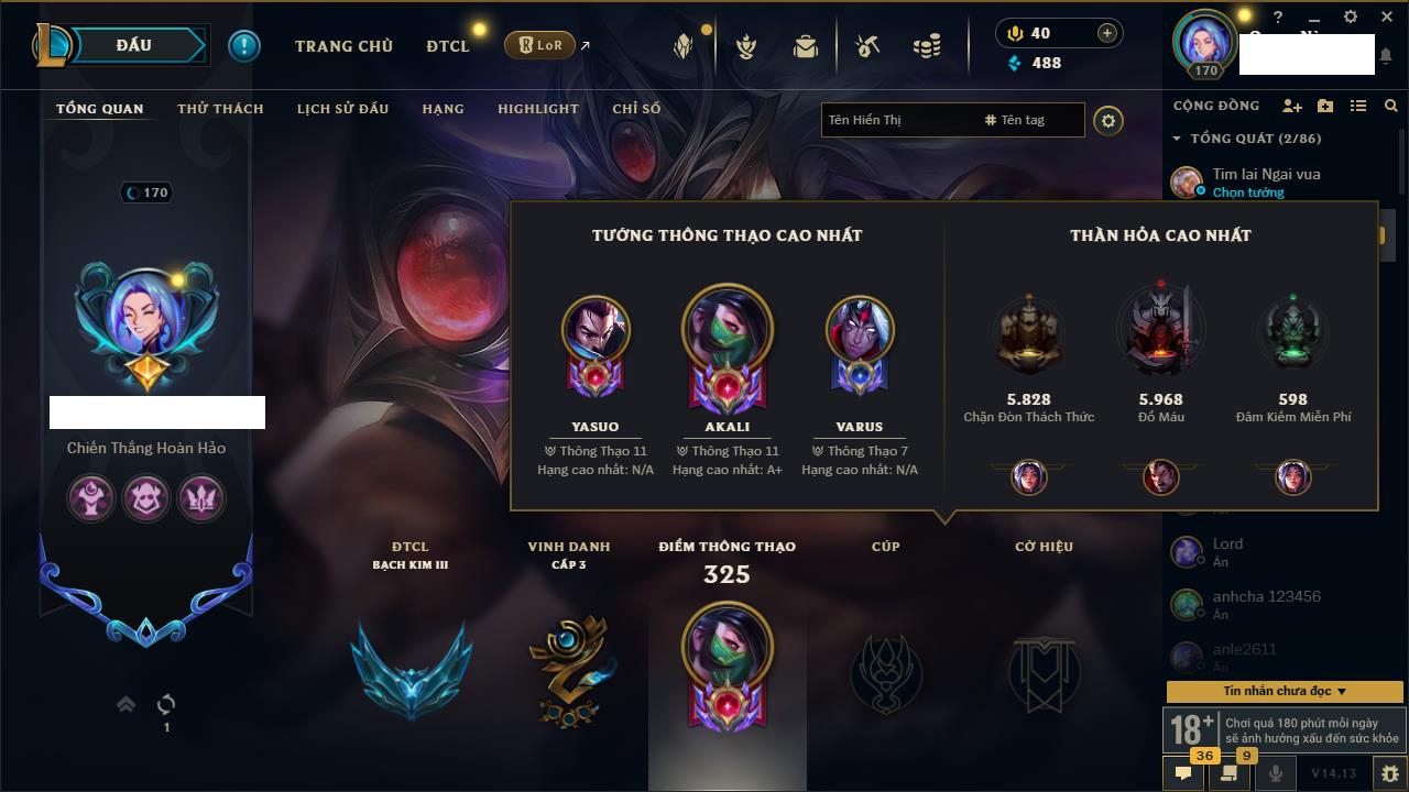 Rank Đơn: Bạch Kim IIKhung: Bạch kimTướng: 171 - Còn 316137 THXTrang Phục: 89Rank ĐTCL: Bạch Kim IIILinh Thú: 94