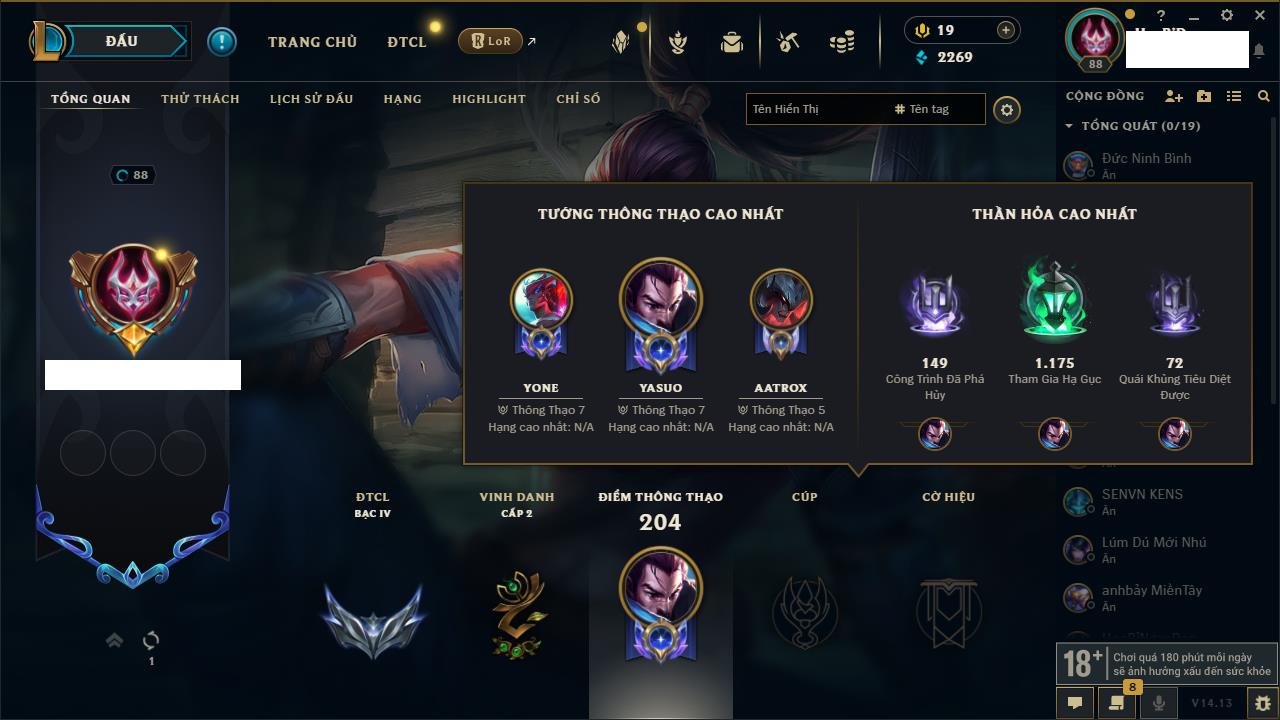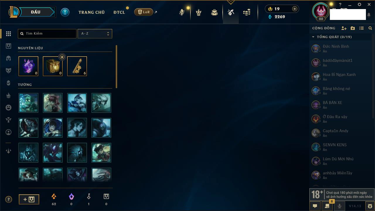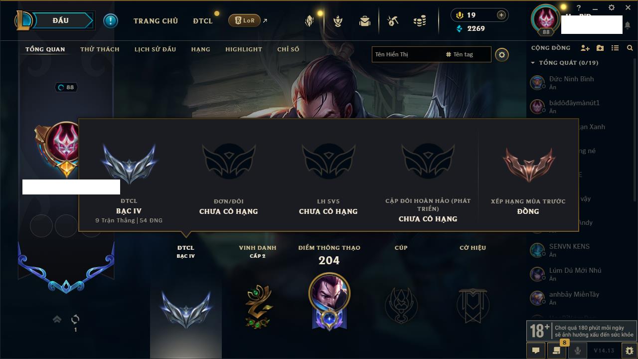 Rank Đơn: Vàng IIIKhung: BạcTướng: 171 - Còn 101359 THXTrang Phục: 88Rank ĐTCL: Kim Cương IVLinh Thú: 200